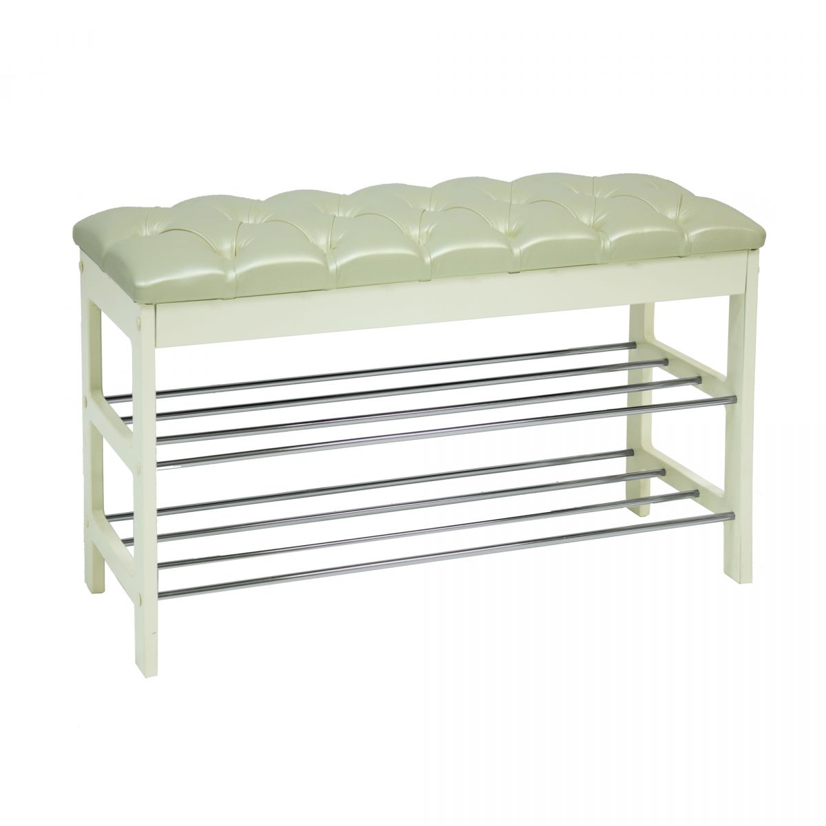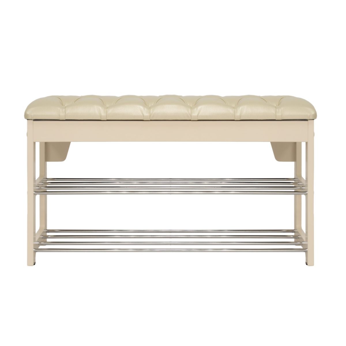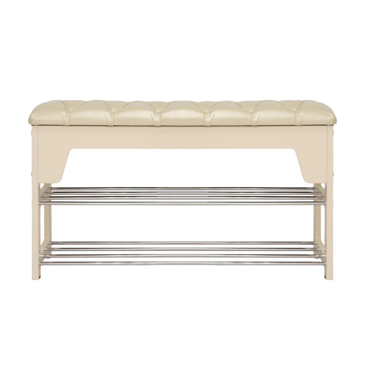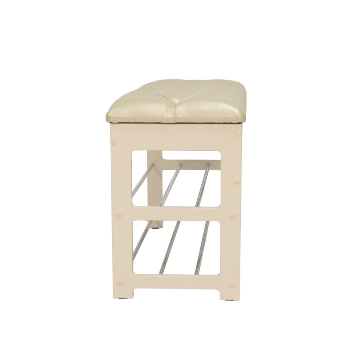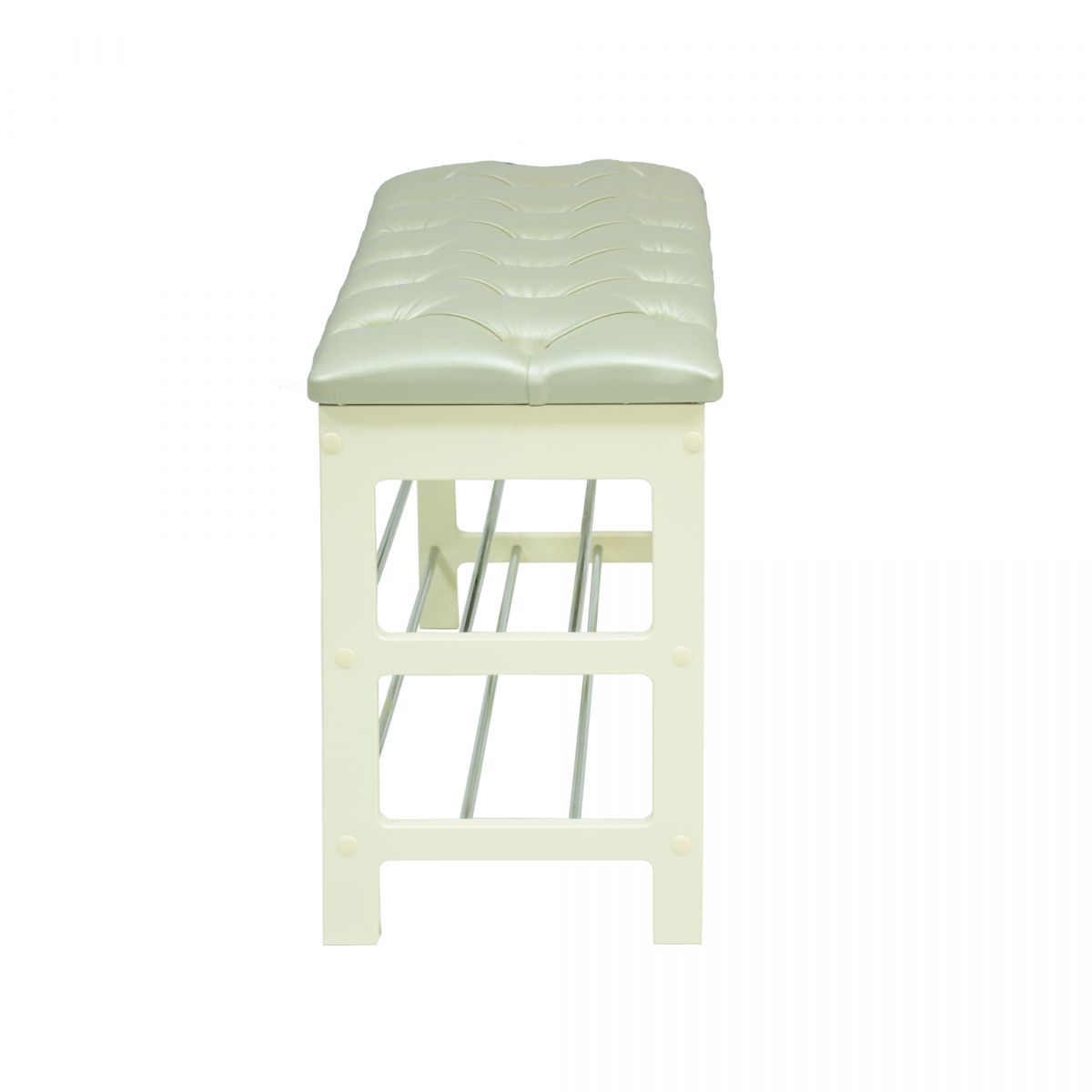 Широкая двухместная банкетка с мягким сиденьем и полкой для обуви. Она сделана в незамысловатом дизайне и органично впишется в любой интерьер.