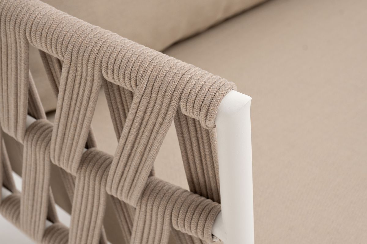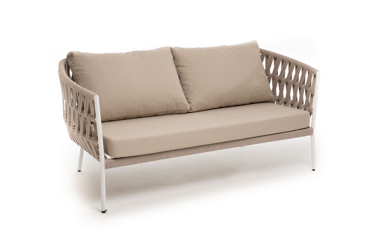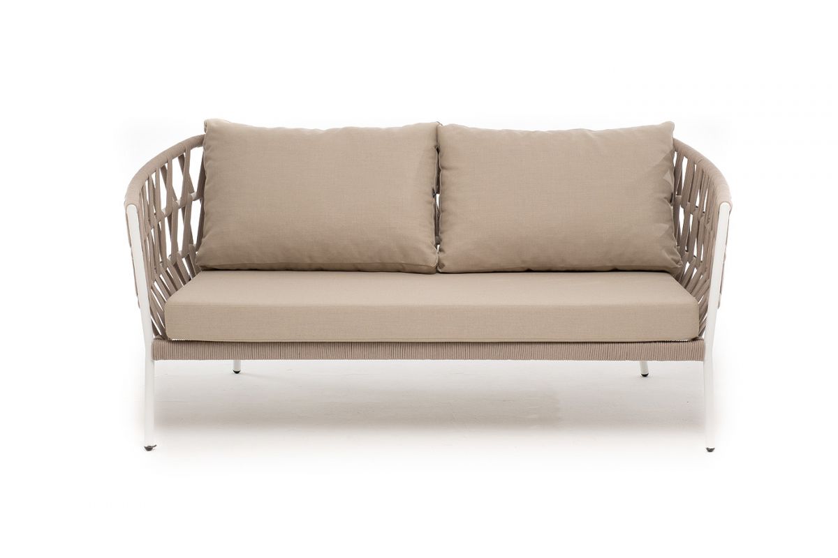 4. "Диего" диван 2-местный плетеный из роупа, каркас алюминий белый муар, роуп бежевый круглый, ткань б