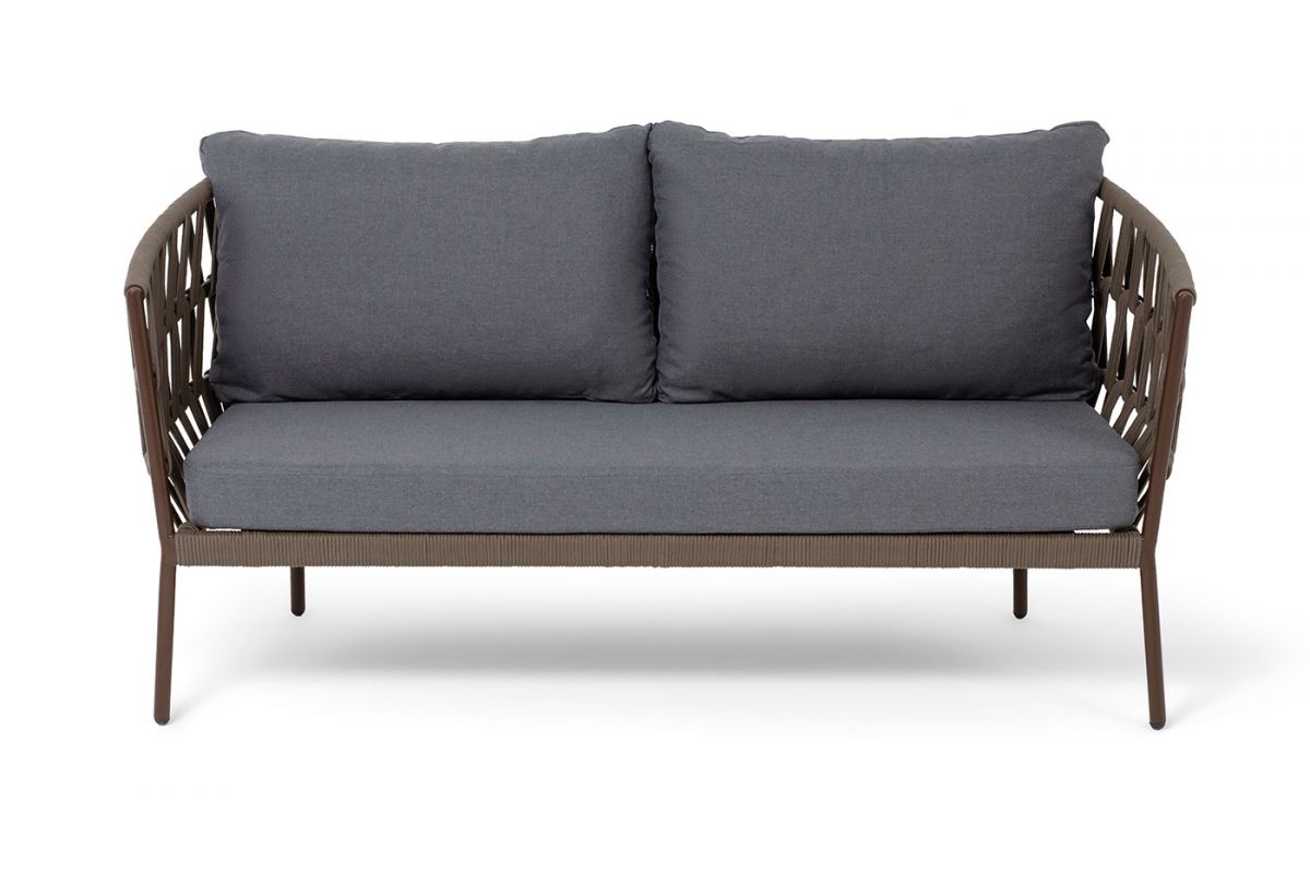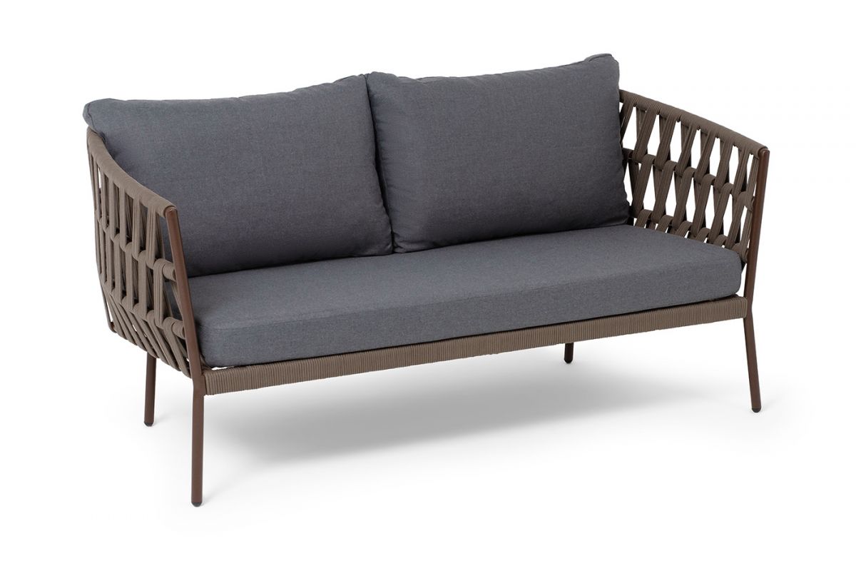 Двухместный диван «Диего» с подушками в комплекте.Диван имеет алюминиевый каркас, окрашенный порошковой краской в коричневый (RAL8016) цвет. Боковины каркаса и спинка вручную оплетены роупом - эластичными синтетическими лентами, изготовленными из высокопрочных полиэфирных волокон. Цвет оплетки - коричневый.Подушки состоят из наполнителя и съёмных чехлов, которые обработаны влагоотталкивающей пропиткой темно-серого цвета. Материал - 100% полиэстер, плотностью 300гр/м2. Размер плетеного дивана: 1580×720×770 мм.