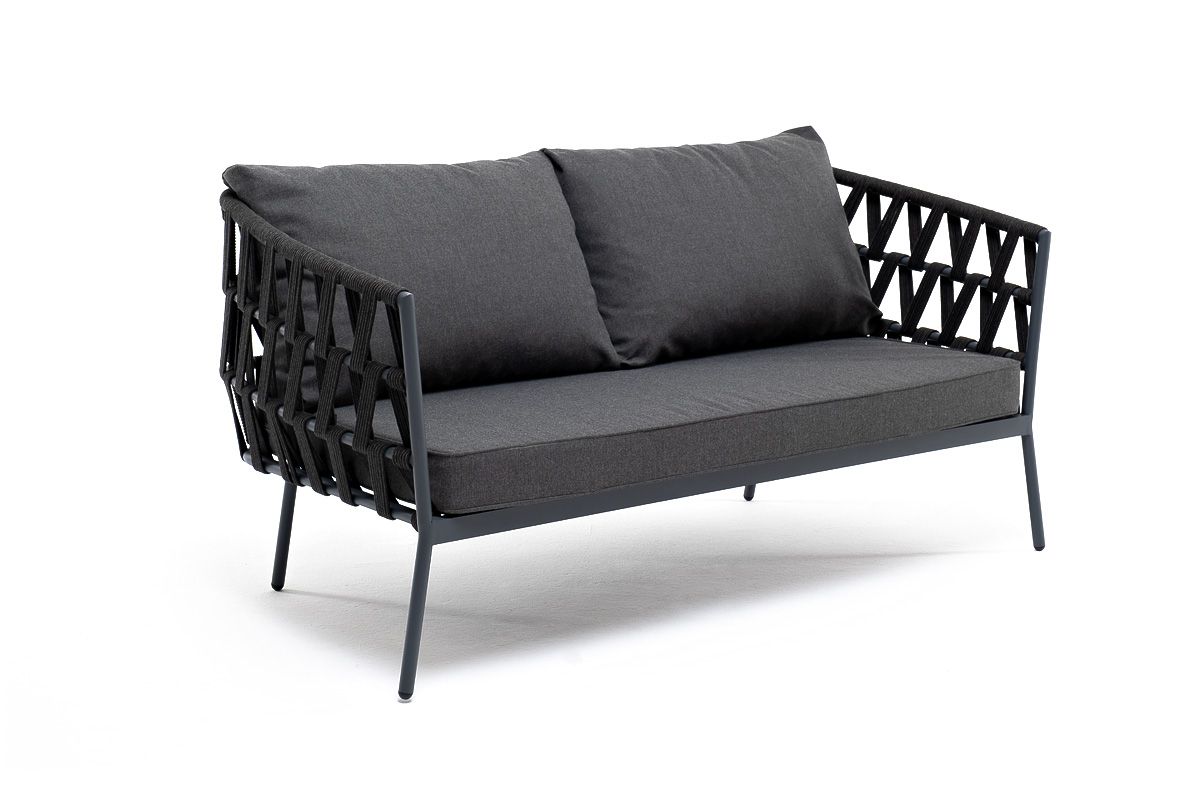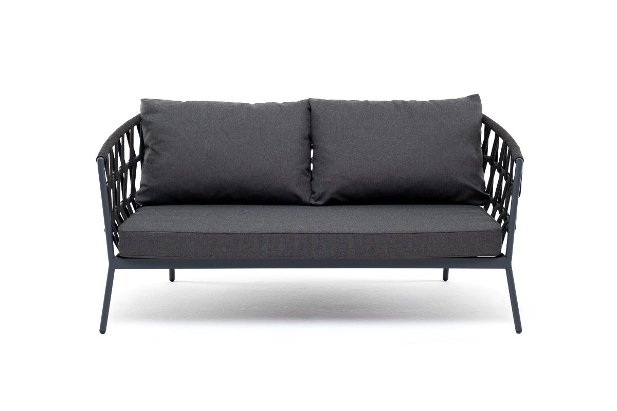 Двухместный диван «Диего» с подушками в комплекте.Диван имеет алюминиевый каркас, окрашенный порошковой краской в темно-серый (RAL7024) цвет. Боковины каркаса и спинка вручную оплетены роупом - эластичными синтетическими лентами, изготовленными из высокопрочных полиэфирных волокон. Цвет оплетки - темно-серый.Подушки состоят из наполнителя и съёмных чехлов, которые обработаны влагоотталкивающей пропиткой темно-серого цвета. Материал - 100% полиэстер, плотностью 300гр/м2. Размер плетеного дивана: 1580×720×770 мм.