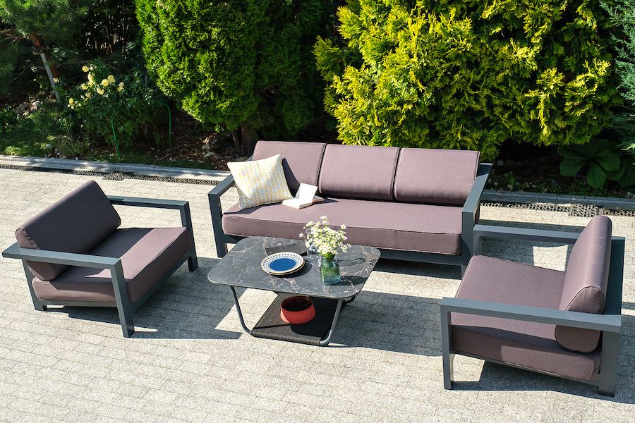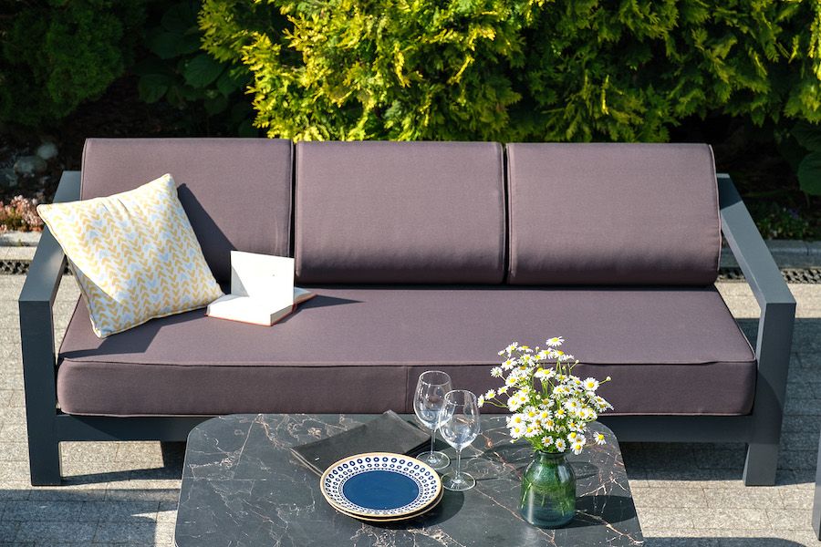 Стильный трехместный диван «Гранада» для обустройства зоны отдыха на балконе, в кафе или летней веранде. Каркас изготовлен из высокопрочного алюминия темно-серого (RAL7024) цвета. В комплекте предусмотрены мягкие подушки со съёмными чехлами. Диван также подходит для всесезонного использования на открытом воздухе.Габаритные размеры: 2000×900×550 мм. Диван можно доукомплектовать креслами из этой же линейки, создав лаунж-зону с большим количеством мест.