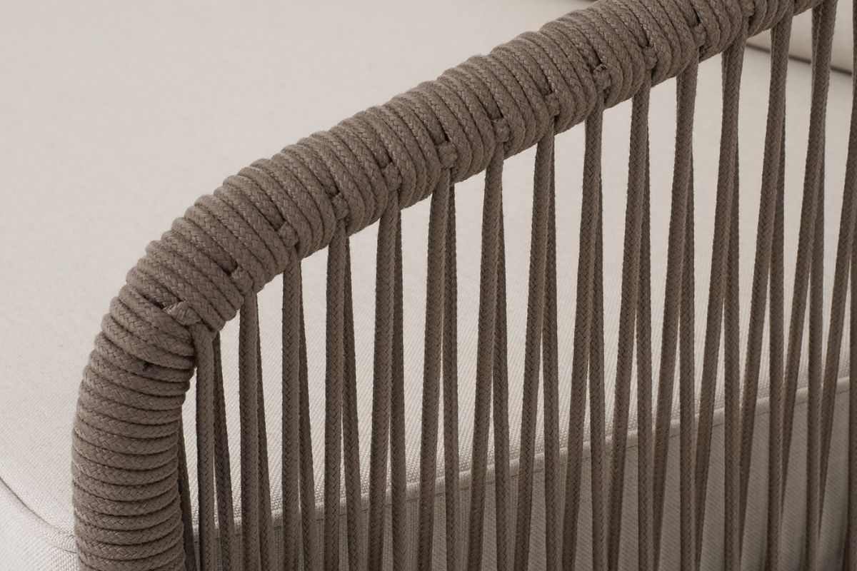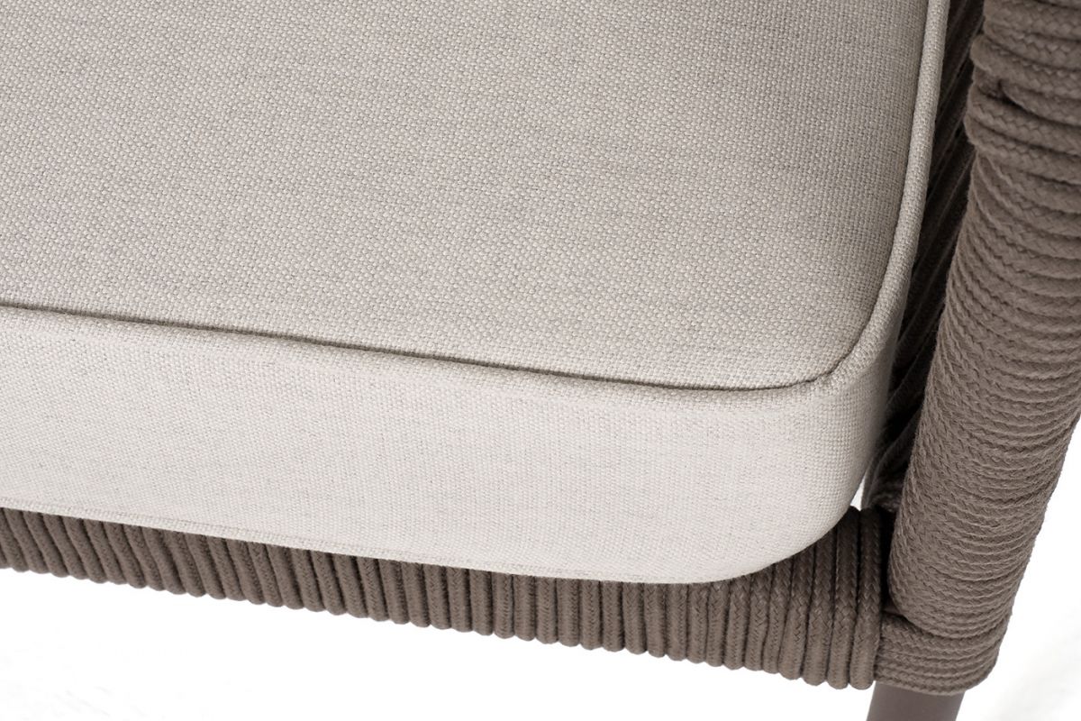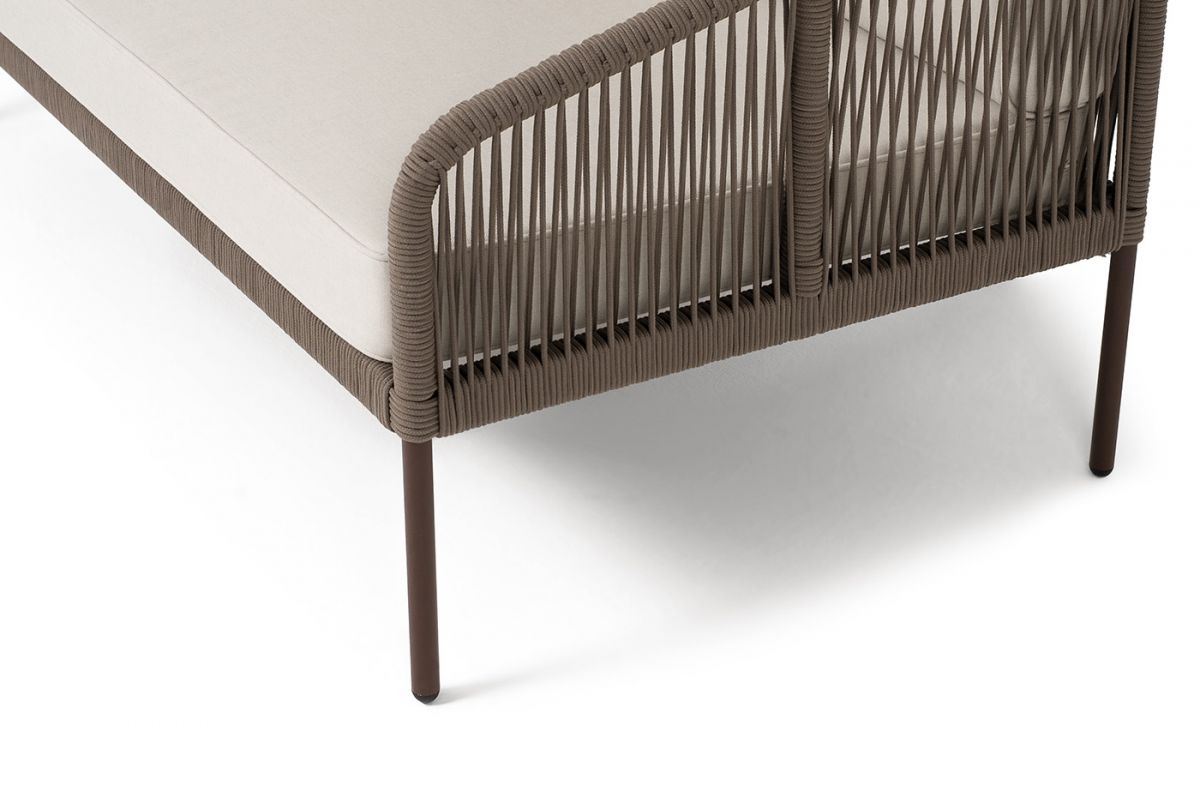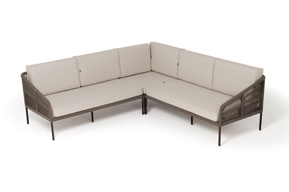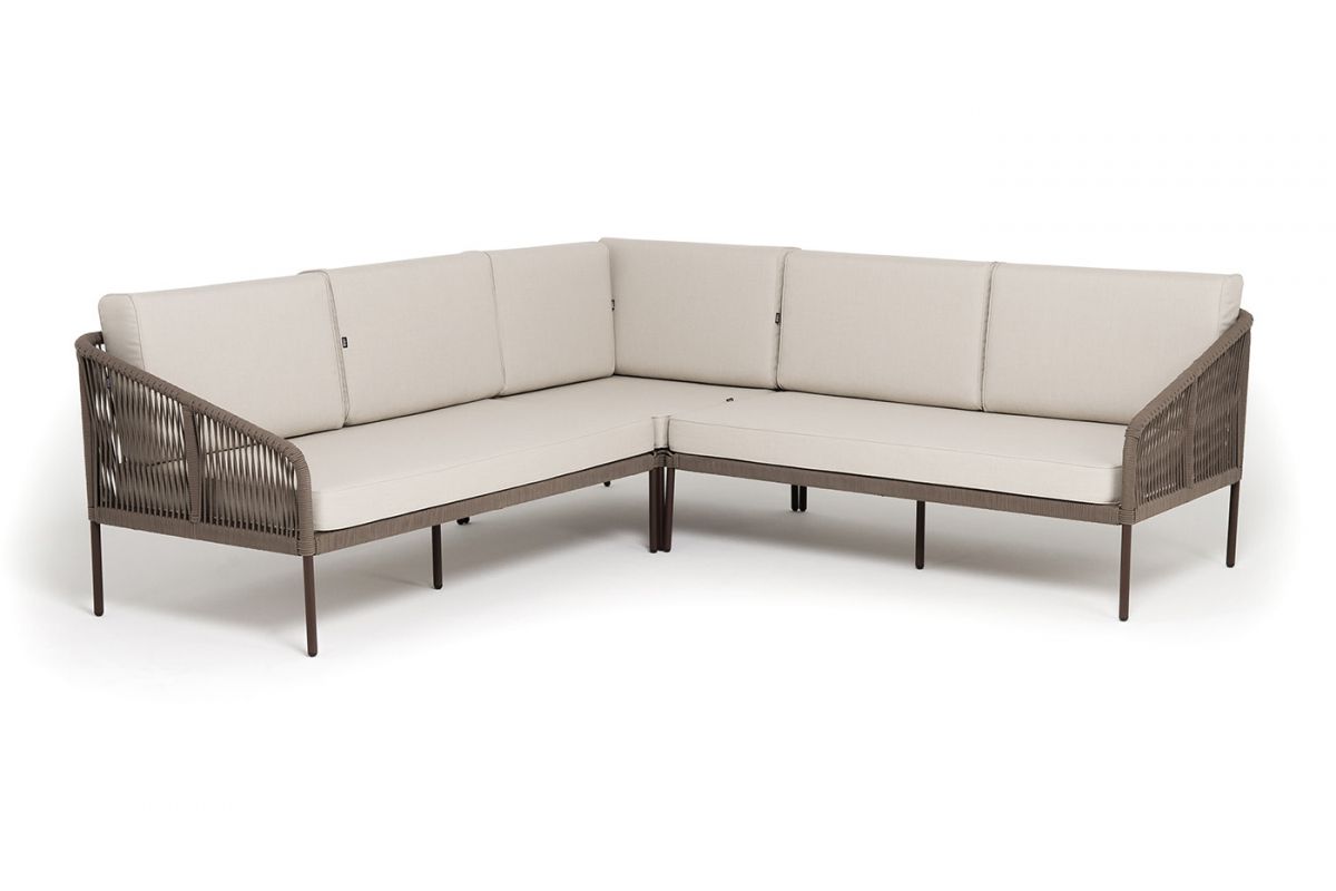 Модульный диван «Канны». Состоит из трех модулей:- правый модуль - 1480×850×750 мм.- угловой модуль - 850×850×750 мм.- левый модуль - 1480×850×750 мм.Диван имеет алюминиевый каркас, окрашенный порошковой краской в коричневый (RAL8016) цвет. Боковины каркаса вручную оплетены роупом - эластичными синтетическими лентами, изготовленными из высокопрочных полиэфирных волокон. Цвет оплетки - коричневый.Подушки состоят из наполнителя и съёмных чехлов. Материал - 100% полиэстер, плотностью 300гр/м2. "Канны" левый модуль плетеный из роупа, каркас алюминий коричневый (RAL8016) муар, роуп коричневый круглый, ткань бежевая 035 1шт. 1 480Х850Х750, "Канны" правый модуль плетеный из роупа, каркас алюминий коричневый (RAL8016) муар, роуп коричневый круглый, ткань бежевая 035 1шт. 1 480Х850Х750, "Канны" угловой модуль плетеный из роупа, каркас алюминий коричневый (RAL8016) муар, роуп коричневый круглый, ткань бежевая 035 1шт. 850Х850Х750,