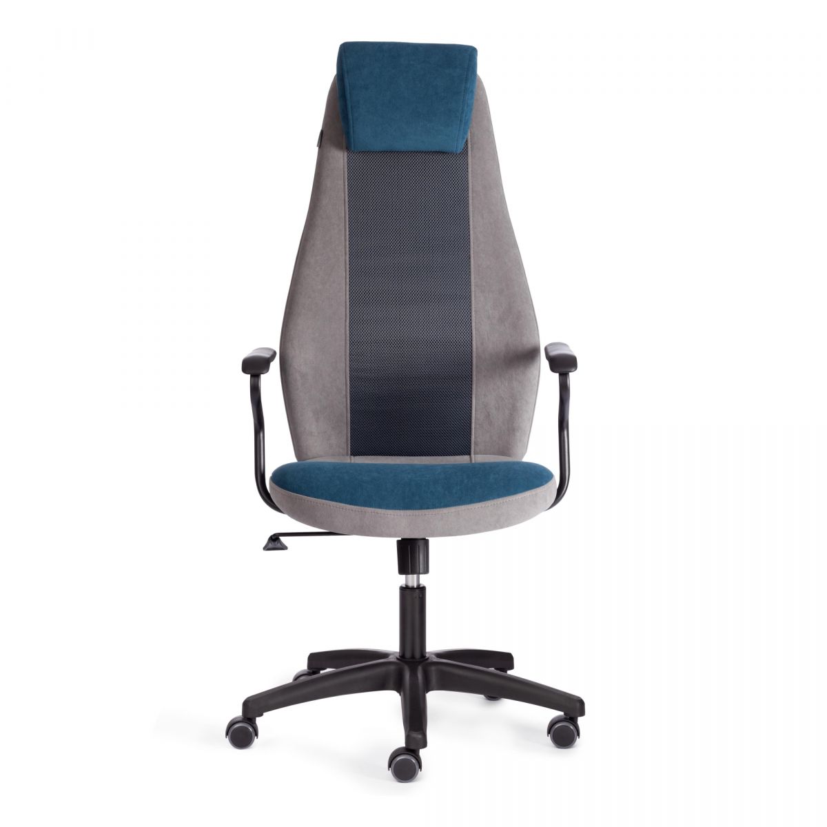 флок, ткань , синий/серый/серый, 32/29/W-12 Компьютерное кресло AVIATOR - удачное сочетание привлекательности, эргономичности и функциональности. Стильная модель будет отлично смотреться в любом рабочем кабинете. 5-лучевая крестовина диаметром 650 мм устойчива, прочна и имеет долгий срок службы. Фиксированные подлокотники из металлической трубы диаметром 19 мм с пластиковой накладкой, механизм изменения высоты сиденья и угла наклона до 15 градусов с возможностью фиксации в рабочем положении, настраиваемый подголовник на липучке позволят принять комфортную позу, снять напряжение с позвоночника. Высококачественные полиамидные ролики дополнительно прорезинены для предотвращения повреждения напольного покрытия. Отлично подходят для использования на паркете и ламинате. Диаметр штока ролика – 11 мм. Для максимального удобства кресло оснащено наполнителем из пенополиуретана (ППУ) плотностью не менее 30 кг/м3. Модель обита износостойким флоком плотностью 320 г/м2 с водоотталкивающей про