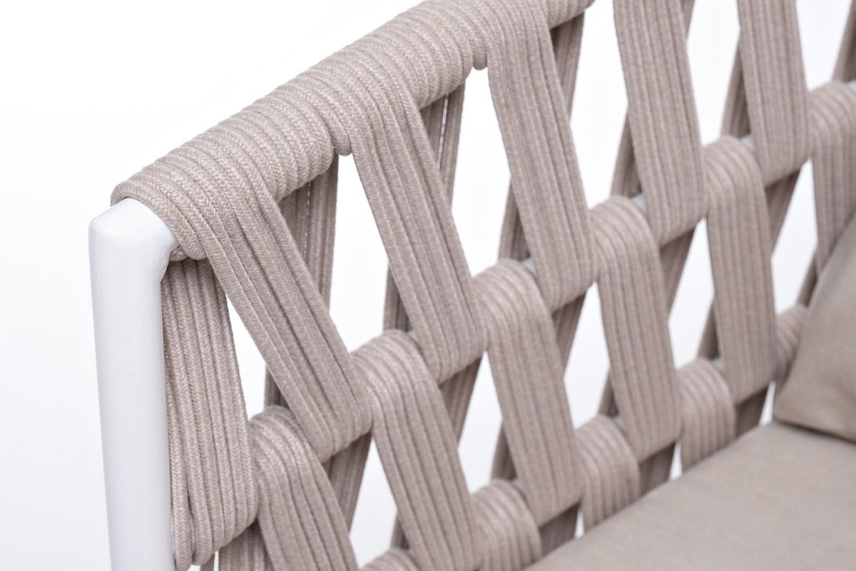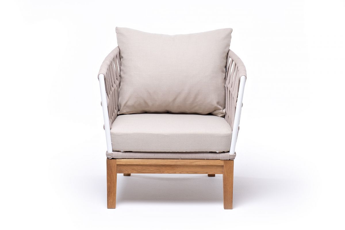 Плетеное кресло «Диего» с подушками в комплекте.Основание кресла - дуб, каркас из алюминия светло-серого (RAL7035) цвета.Боковины каркаса вручную оплетены роупом - эластичными синтетическими лентами, изготовленными из высокопрочных полиэфирных волокон. Цвет оплетки - бежевый.Подушки со съёмными чехлами, которые обработаны влагоотталкивающей пропиткой. Материал - 100% полиэстер, плотностью 300гр/м2.Размер кресла: 770×720×800 мм.