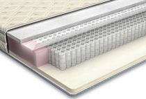 Одна сторона-наполнитель Холлофайбер Хард-синтетическое нетканное полотно, которое обеспечивает матрасу упругость, достаточную для сохранения начальной формы (чуть мягче матраса с кокосом). Другая сторона- искусственный латекс, пропитанный антибактериальным гипоаллергенным составом. Латекс имеет мелкоячеистую структуру, которая вместе с пропиткой обеспечивает гигроскопичность. По своим физическим свойствам искусственный латекс более упругий по сравнению с натуральным латексом. Низкая стоимость этого наполнителя делает его весьма привлекательным материалом для изготовления oртопeдических матрасов. В качестве основы матраса используется пружинный блок Duet, который имеет особую конструкцию - "пружина в пружине", т.е. в "основную" пружину вкладывается пружина меньшего диаметра. И в случае если внешняя пружина, которая имеет больший диаметр, не может справиться с нагрузкой, ее поддерживает внутренняя. При такой конструкции матрас обеспечивает надежную поддержку для позвоночника человека с