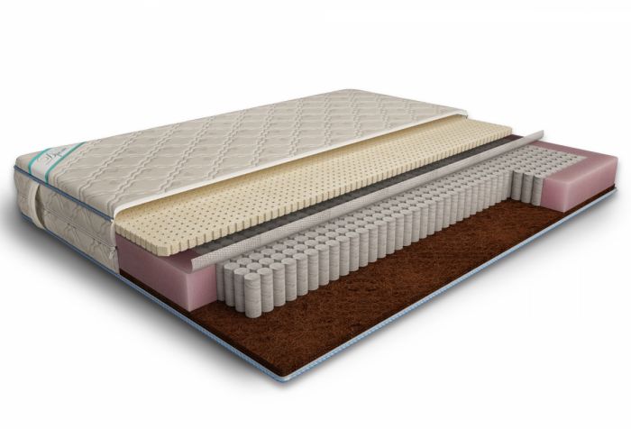 Матрас не симметричен по жесткости относительно пружинного блока, т.е. имеет две стороны разной жесткости. Одна сторона жесткая с наполнителем кокос, другая только высокоэластичный Латекс-Memory Form - мягкая сторона. Латекс-Мемори- современный материал, который тонко реагируя на вес и тепло человека и легко подстраивается, повторяя контуры тела. Он практически не оказывает давления на тело лежащего, фактически приобретая его форму. Кроме того, этот поролон обладает антимикробными свойствами. Преимущества Латекс-Мемори - менее чувствительный к температуре окружающей среды и дает хорошую воздухопроницаемость. Кокосовое волокно (койра)-натуральный материал, обладает бактерицидным свойством, не гниет ни при какой влажности, не вызывает аллергических реакций. В качестве основы матраса используется пружинный блок Duet, который имеет особую конструкцию - "пружина в пружине", т.е. в "основную" пружину вкладывается пружина меньшего диаметра. И в случае если внешняя пружина, которая имеет больш