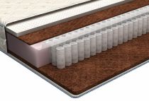Матрас не симметричен по жесткости относительно пружинного блока, т.е. имеет две стороны разной жесткости. Одна сторона средняя с наполнителем кокос и натуральный латекс, другая только кокос - жесткая сторона. Натуральные наполнители и независимый пружинный блок-серьезная забота о своем здоровье. Натуральный латекс - не вызывает аллергии, не впитывает влагу, проявляет бактерицидные свойства. Он идеально повторяет контуры вашего тела, обеспечивая при этом максимальный комфорт и имеет длительный срок службы при постоянной нагрузке. Кокосовое волокно (койра)-натуральный материал, обладает бактерицидным свойством, не гниет ни при какой влажности, не вызывает аллергических реакций. В качестве основы матраса используется пружинный блок Duet, который имеет особую конструкцию - "пружина в пружине", т.е. в "основную" пружину вкладывается пружина меньшего диаметра. И в случае если внешняя пружина, которая имеет больший диаметр, не может справиться с нагрузкой, ее поддерживает внутренняя. При та
