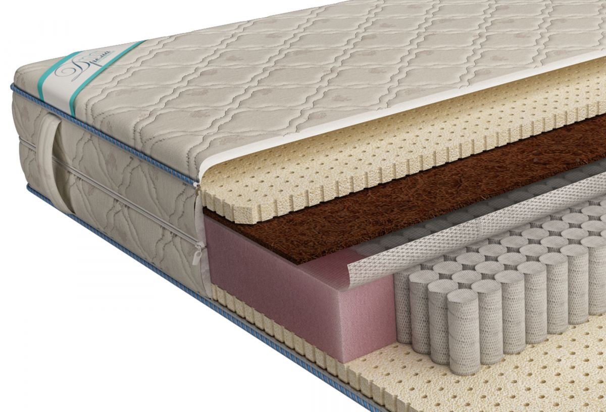 Матрас не симметричен по жесткости относительно пружинного блока, т.е. имеет две стороны разной жесткости. Одна сторона средняя с наполнителем кокос и высокоэластичный Латекс-Memory Foam, другая только Латекс-Memory Foam - мягкая сторона. Латекc Memory Foam современный материал, который тонко реагируя на вес и тепло человека и легко подстраивается, повторяя контуры тела. Он практически не оказывает давления на тело лежащего, фактически приобретая его форму. Кроме того, этот поролон обладает антимикробными свойствами. Преимущества Латекс-Мемори - менее чувствительный к температуре окружающей среды и дает хорошую воздухопроницаемость. Кокосовое волокно (койра)-натуральный материал, обладает бактерицидным свойством, не гниет ни при какой влажности, не вызывает аллергических реакций. В качестве основы матраса используется пружинный блок Duet, который имеет особую конструкцию - "пружина в пружине", т.е. в "основную" пружину вкладывается пружина меньшего диаметра. И в случае если внешняя пр