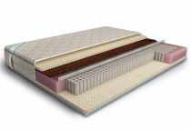 Матрас не симметричен по жесткости относительно пружинного блока, т.е. имеет две стороны разной жесткости. Одна сторона средняя с наполнителем кокос и высокоэластичный Латекс-Memory Foam, другая только Латекс-Memory Foam - мягкая сторона. Латекc Memory Foam современный материал, который тонко реагируя на вес и тепло человека и легко подстраивается, повторяя контуры тела. Он практически не оказывает давления на тело лежащего, фактически приобретая его форму. Кроме того, этот поролон обладает антимикробными свойствами. Преимущества Латекс-Мемори - менее чувствительный к температуре окружающей среды и дает хорошую воздухопроницаемость. Кокосовое волокно (койра)-натуральный материал, обладает бактерицидным свойством, не гниет ни при какой влажности, не вызывает аллергических реакций. В качестве основы матраса используется пружинный блок Duet, который имеет особую конструкцию - "пружина в пружине", т.е. в "основную" пружину вкладывается пружина меньшего диаметра. И в случае если внешняя пр