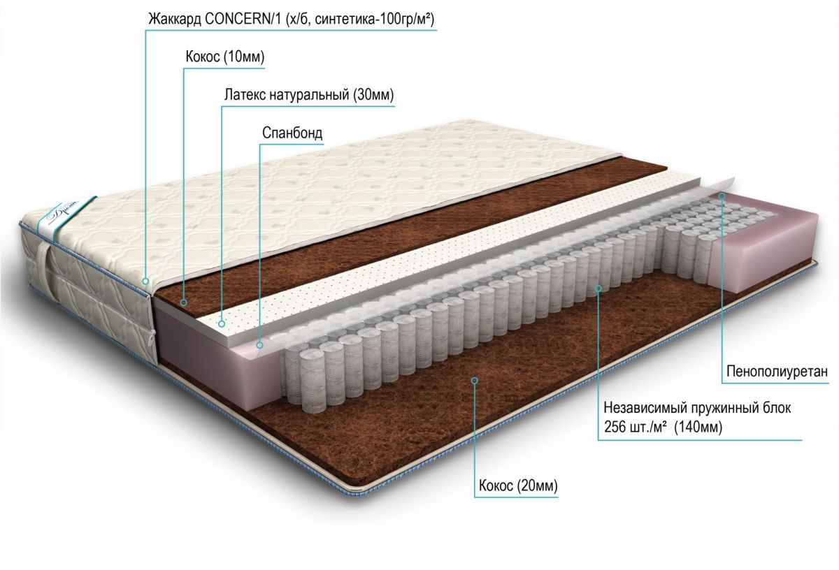 Создан на основе независимого пружинного блока TFK. В качестве наполнителя используется комбинация из кокосовой койры- натуральный материал, придает естественные вентиляционные свойства, эластичность, прочность, упругость, гигиеничность, антиаллергеность, антимикробность, долговечность) и натурального латекса (натуральный материал, представляющий собой вспененный сок дерева гевеи). С другой стороны, латексированная кокосовая койра. Приятная на ощупь матрасная ткань обладает высокой прочностью и долговечностью. Чехол съемный, имеет молнию по трем сторонам матраса. Плотная классическая полусинтетическая матрасная ткань с особым жаккардовым плетением, приятная на ощупь и безупречно устойчивая к истиранию. Комплектация Основа: пружинный блок TFK (256/м2), высота: 14 см 1 сторона умеренно-жесткая, наполнитель - кокосовая койра (1см), натуральный латекс (3см) 2 сторона жесткая, наполнитель - кокосовая койра (2см) Высота матраса: 20 см Жесткость матраса: умерено- жесткая, жесткая