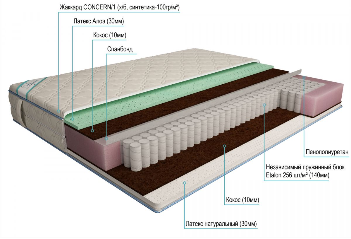 Данная модель создана на основе независимого пружинного блока TFK. В качестве наполнителя используется комбинация из латекса Аloe Vera (натуральный латекс из сока гевеи, в процессе вспенивания смешан с искусственным латексом. В процессе производства в него введены микрокапсулы Аloe Vera, которые служат мощным природным гипоаллергенным антиоксидантом) и кокосовой койры- натуральный материал, придает естественные вентиляционные свойства, эластичность, прочность, упругость, гигиеничность, антиаллергеность, антимикробность, долговечность). С другой стороны комбинация из кокосовой койры и натурального латекса (натуральный материал, представляющий собой вспененный сок дерева гевеи). Приятная на ощупь матрасная ткань обладает высокой прочностью и долговечностью. Чехол съемный, имеет молнию по трем сторонам матраса. Плотная классическая полусинтетическая матрасная ткань с особым жаккардовым плетением, приятная на ощупь и безупречно устойчивая к истиранию. Oртопeдический матрас со средне-жестк