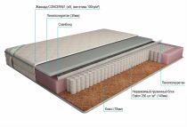 Матрас не симметричен по жесткости относительно пружинного блока, т.е. имеет две стороны разной жесткости. Одна сторона жесткая с наполнителем Кокос, другая средней жесткости с наполнителем пенополиуретан. Кокос - это экологически чистый, долговечный, природный материал, получаемый из ореха кокосовой пальмы. Преимущества этого материала: пропитанный латексом обладает бактерицидным свойством, не гниет ни при какой влажности, не вызывает аллергических реакций. Полужесткая структура койры обеспечивает оптимальную упругость и долговечность. Пенополиуретан - износостойкий, вязко-эластичный и прекрасно вентилируемый мягкий материал. Пружинный блок - наиболее распространенный вид независимых пружинных блоков для матрасов. Состоит из пружин, заключенных в отдельные тканевые чехлы. Точечно распределяет вес тела, сохраняя автономную работу каждой пружины. Пружины подстраиваются под вес и форму тела человека, что обеспечивает поддержку и правильное положение позвоночника во время сна. Чехол съем