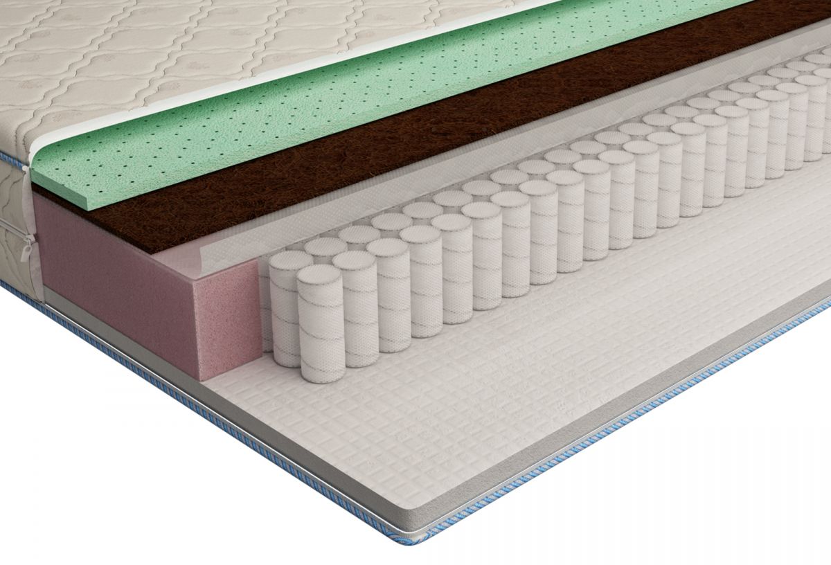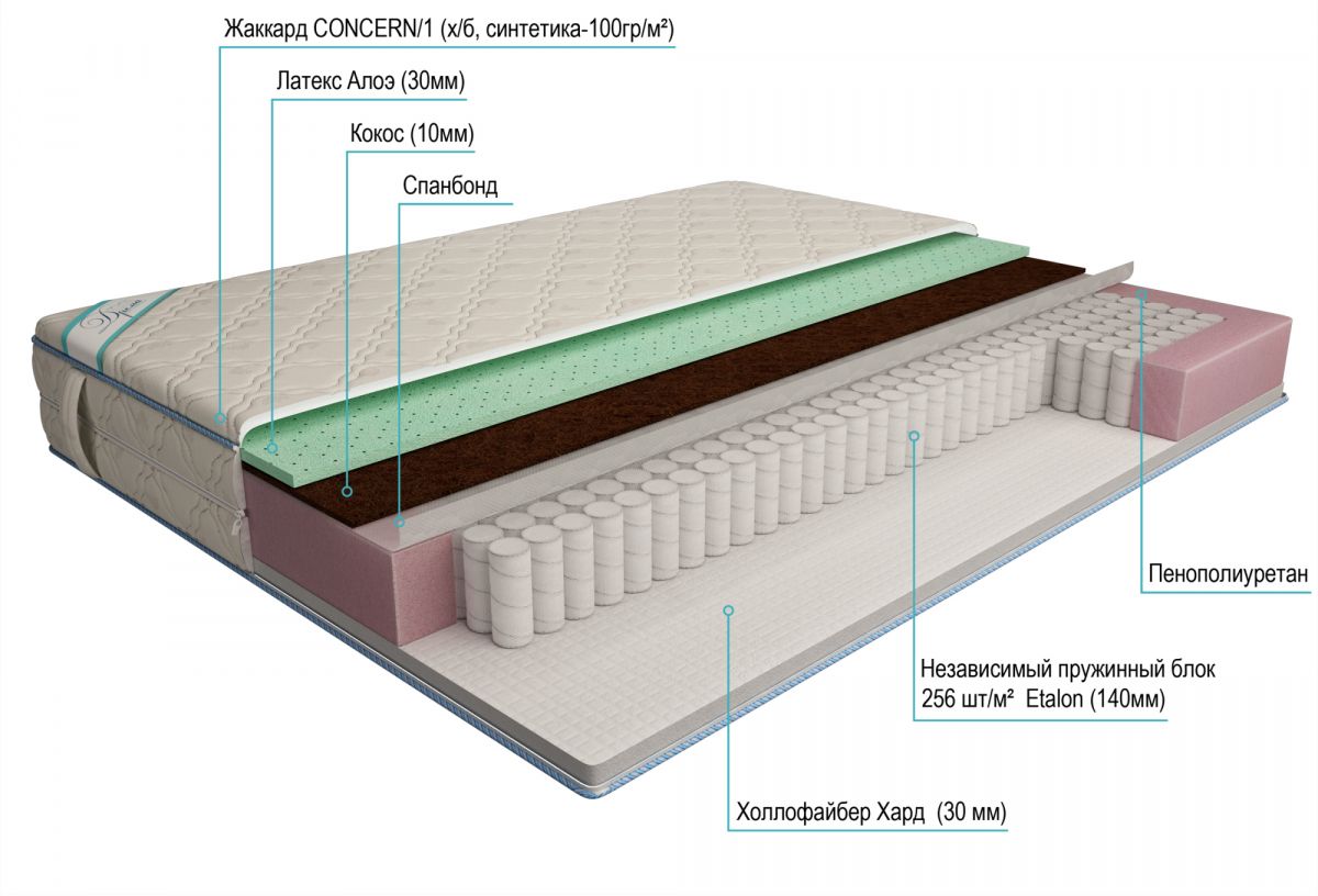Ложась на такой матрас человек погружается в уютную атмосферу здорового комфорта. Создан на основе независимого пружинного блока TFK. В качестве наполнителя с одной стороны Холлофайбер-Хард - жесткое синтетическое нетканое полотно, обладает низкой сорбционной способностью, не впитывает даже парообразной влаги. Не крошится, не дает усадки. С другой стороны комбинация из кокоса (100% натуральный материал, представляет собой пропаренные волокна кокосового ореха и прессованной в маты правильной формы) и латекса Аloe Vera (натуральный латекс из сока гевеи, в процессе вспенивания смешан с искусственным латексом. В процессе производства в него введены микрокапсулы Алоэ Вера, которые служат мощным природным гипоаллергенным антиоксидантом). Приятная на ощупь матрасная ткань обладает высокой прочностью и долговечностью. Чехол съемный, имеет молнию по трем сторонам матраса. Плотная классическая полусинтетическая матрасная ткань с особым жаккардовым плетением, приятная на ощупь и безупречно устойч