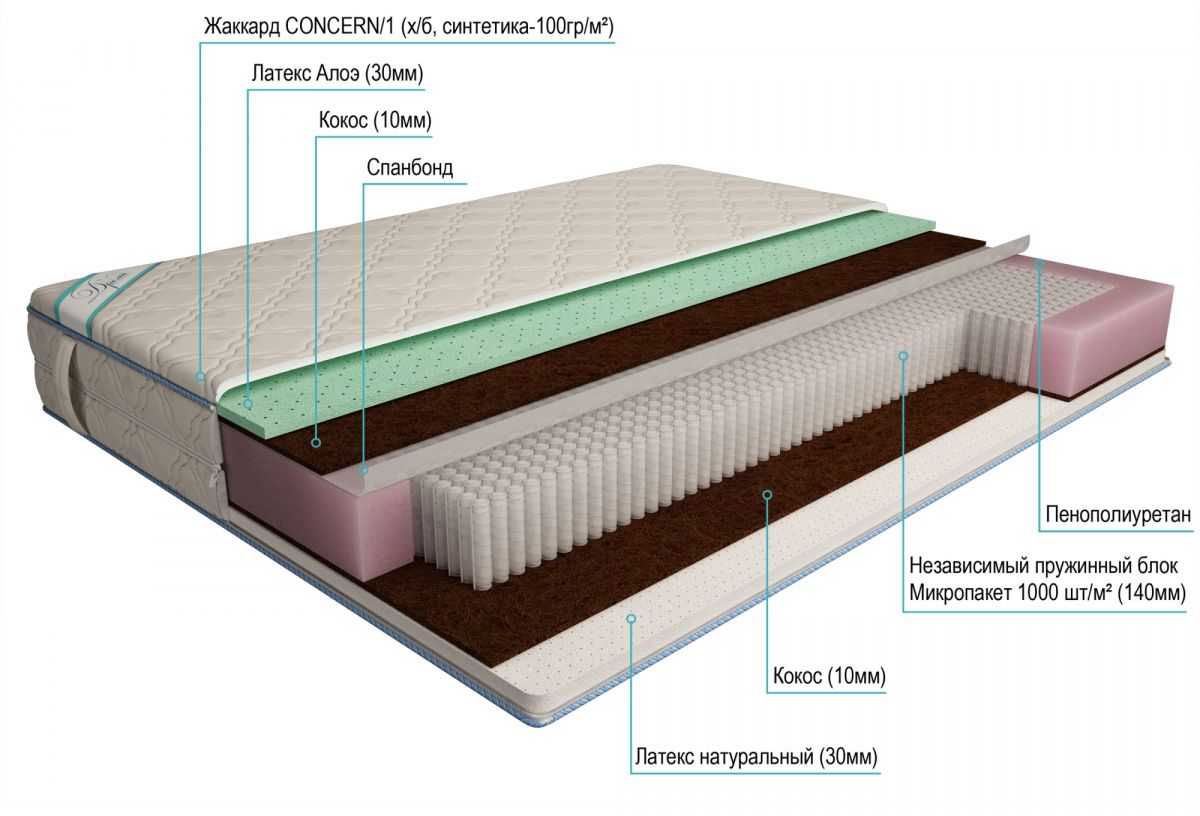 Современный блок "микропакет". Матрас с такой системой предупреждает искривление позвоночника и выдерживает серьезные нагрузки. Приятная на ощупь матрасная ткань обладает высокой прочностью и долговечностью. В качестве наполнителя используются натуральные латекс из сока гевеи, выращенной на бразильских плантациях, в процессе вспенивания смешан с искусственным латексом. Алоэ Вера укрепляет иммунитет, оказывает мягкий расслабляющий эффект, способствует уменьшению воспалительных процессов. Кокосовая койра обеспечивает долговечность и износостойкость, повышенную жесткость. Латекс натуральный -материал, представляющий собой вспененный сок дерева гевеи. Чехол съемный, имеет молнию по трем сторонам матраса. Плотная классическая полусинтетическая матрасная ткань с особым жаккардовым плетением, приятная на ощупь и безупречно устойчивая к истиранию. Основа - Независимый пружинный блок Mikropaket (1000/м2), высота: 14 см 1 сторона - средняя жесткость, наполнитель латекс Алоэ Вера (3см), напо