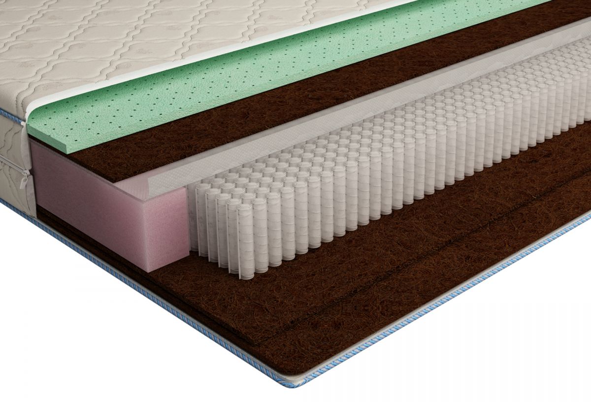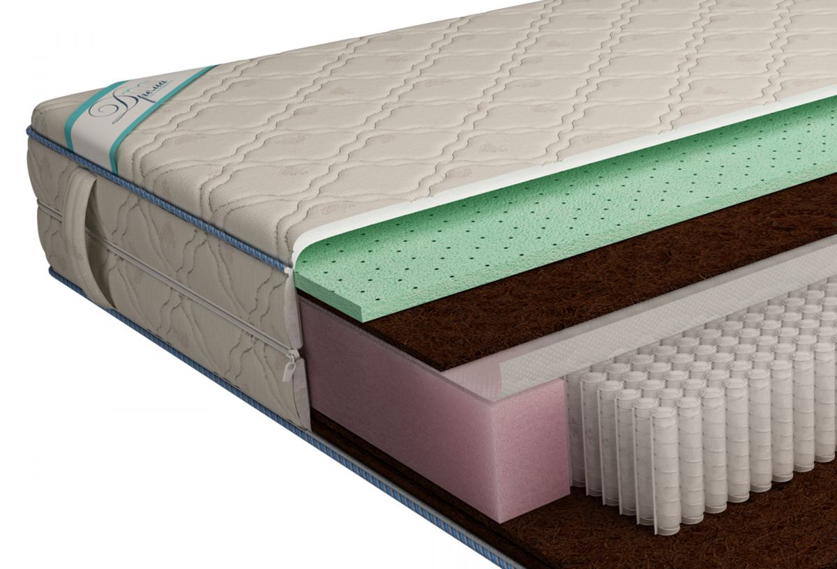 Современный блок "микропакет". Матрас с такой системой предупреждает искривление позвоночника и выдерживает серьезные нагрузки. Приятная на ощупь матрасная ткань обладает высокой прочностью и долговечностью. В качестве наполнителя используются натуральные латекс из сока гевеи, выращенной на бразильских плантациях, в процессе вспенивания смешан с искусственным латексом. Алоэ Вера укрепляет иммунитет, оказывает мягкий расслабляющий эффект, способствует уменьшению воспалительных процессов. Кокосовая койра обеспечивает долговечность и износостойкость, повышенную жесткость. Чехол съемный, имеет молнию по трем сторонам матраса. Плотная классическая полусинтетическая матрасная ткань с особым жаккардовым плетением, приятная на ощупь и безупречно устойчивая к истиранию. Основа - Независимый пружинный блок Mikropaket (1000/м2), высота: 14 см 1 сторона - средняя жесткость, наполнитель латекс Алоэ Вера (3см), наполнитель кокос натуральный (1см) 2 сторона – жесткая, Кокос (2см) Высота матра