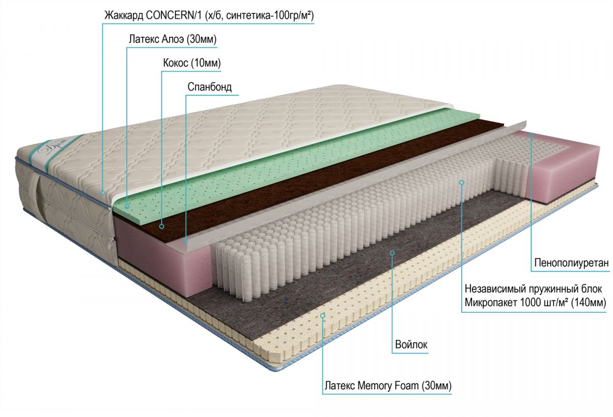 Современный блок "микропакет". Матрас с такой системой предупреждает искривление позвоночника и выдерживает серьезные нагрузки. Приятная на ощупь матрасная ткань обладает высокой прочностью и долговечностью. В качестве наполнителя используются натуральные латекс из сока гевеи, выращенной на бразильских плантациях, в процессе вспенивания смешан с искусственным латексом. Алоэ Вера укрепляет иммунитет, оказывает мягкий расслабляющий эффект, способствует уменьшению воспалительных процессов. Кокосовая койра обеспечивает долговечность и износостойкость, повышенную жесткость. Войлок - нетканый материал, состоит из натуральных и синтетических волокон. Высокоэластичный Memory Foam ППУ имеет пористую структуру — он состоит из множества ячеек. Открытая форма ячеек позволяет им сжиматься. Под действием человеческого веса ячейки сжимаются, и материал принимает анатомическую форму тела. Когда это действие прекращается, материал ещё удерживает форму контуров тела 3-4 секунды, а через 10 секунд возвр