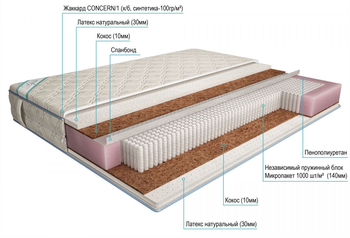 Современный блок "микропакет". Матрас с такой системой предупреждает искривление позвоночника и выдерживает серьезные нагрузки. Сочетание двух противоположных по жесткости наполнителей позволяет гармонично объединить надежную поддержку и приятное ощущение поверхностной мягкости. Тонкая кокосовая койра служит для равномерного распределения давления и значительно повышает устойчивость матраса к деформации. Латекс - натуральный материал, представляющий собой вспененный сок дерева гевеи. Он идеально повторяет контуры Вашего тела, обеспечивая при этом максимальный комфорт. Модель абсолютно симметрична, что позволяет эксплуатировать при необходимости обе стороны. Приятная на ощупь матрасная ткань обладает высокой прочностью и долговечностью. Чехол съемный, имеет молнию по трем сторонам матраса. Плотная классическая полусинтетическая матрасная ткань с особым жаккардовым плетением, приятная на ощупь и безупречно устойчивая к истиранию. Комплектация Основа - Независимый пружинный блок Mikro