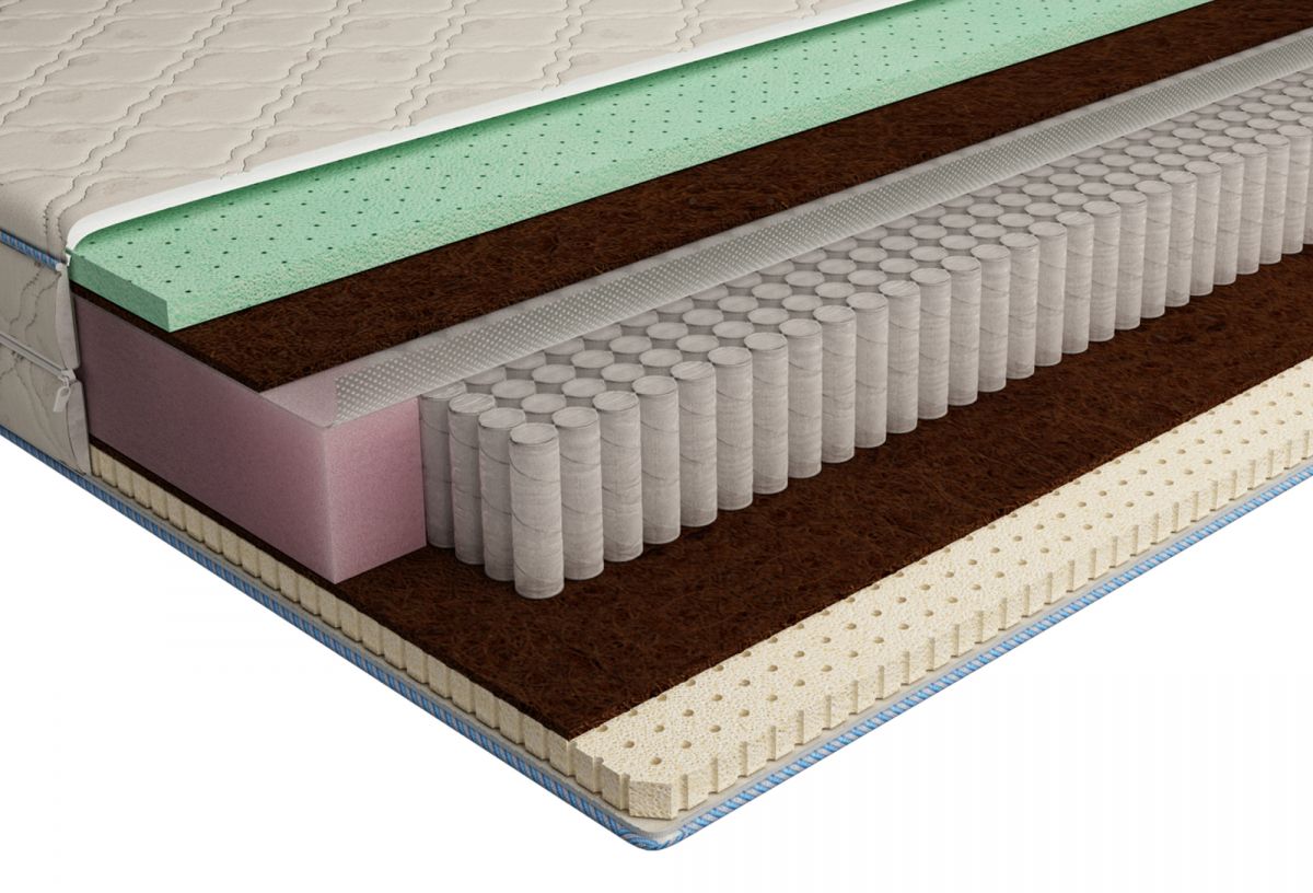 Стороны симметричны по жесткости. Латекс "Aloe Vera" обладает антибактериальной и пыли-, клещестойкой защитой. Не токсичен и не аллергенен. В процессе его производства были введены микрокапсулы Алоэ Вера— мощный природный гипоаллергенный антиоксидант. Алоэ Вера укрепляет иммунитет, оказывает мягкий расслабляющий эффект, способствует уменьшению воспалительных процессов. Кокосовое волокно (койра)-натуральный материал, обладает бактерицидным свойством, не гниет ни при какой влажности, не вызывает аллергических реакций. Латекс Memory Foam - это современный материал, который тонко реагируют на вес и тепло человека и легко подстраивается, повторяя контуры тела. Он практически не оказывает давления на тело лежащего, фактически приобретая его форму и дает хорошую воздухопроницаемость. Пружинный блок «мультипакет», обеспечивает повышенный анатомический и oртопeдический эффект за счет большего количества пружин. Он состоит из отдельных независимых пружин, заключенных в тканевые чехлы. Матрас д