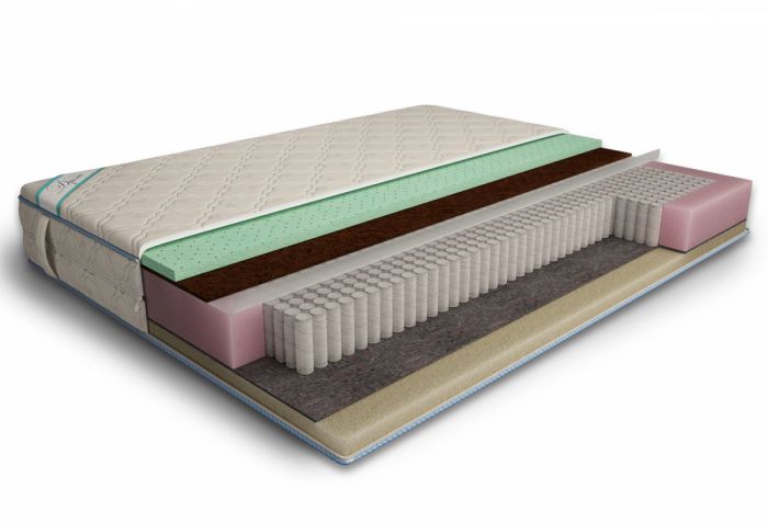 Матрас не симметричен по жесткости относительно пружинного блока, т.е. имеет две стороны разной жесткости. С одной стороны в качестве наполнителей используются Латекс "Aloe Vera" и кокосовое волокно-средняя жесткость, с другой только высокоэластичный Memory Foam ППУ – умеренно-мягкая сторона. Все наполнители не вызывают аллергических реакций. Латекс "Aloe Vera" обладает антибактериальной и пыли-, клещестойкой защитой, не токсичен. В процессе его производства были введены микрокапсулы Алоэ Вера— мощный природный гипоаллергенный антиоксидант. Алоэ Вера укрепляет иммунитет, оказывает мягкий расслабляющий эффект, способствует уменьшению воспалительных процессов. Кокосовое волокно (койра)-натуральный материал, обладает бактерицидным свойством, не гниет ни при какой влажности. Высокоэластичный Memory Foаm ППУ - это современный материал, который тонко реагируют на вес и тепло человека и легко подстраивается, повторяя контуры тела. Он практически не оказывает давления на тело лежащего, факти