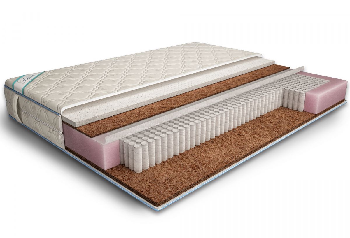 Матрас не симметричен по жесткости относительно пружинного блока, т.е. имеет две стороны разной жесткости. Одна сторона средняя с наполнителем кокос и натуральный латекс, другая только кокос - жесткая сторона. Натуральные наполнители и независимый пружинный блок-серьезная забота о своем здоровье. Натуральный латекс - не вызывает аллергии, не впитывает влагу, проявляет бактерицидные свойства. Он идеально повторяет контуры вашего тела, обеспечивая при этом максимальный комфорт и имеет длительный срок службы при постоянной нагрузке. Кокосовое волокно (койра)-натуральный материал, обладает бактерицидным свойством, не гниет ни при какой влажности, не вызывает аллергических реакций. Пружинный блок «мультипакет», обеспечивает повышенный анатомический и oртопeдический эффект за счет большего количества пружин. Он состоит из отдельных независимых пружин, заключенных в тканевые чехлы. Приятная на ощупь матрасная ткань обладает высокой прочностью и долговечностью. Чехол съемный, имеет молнию по