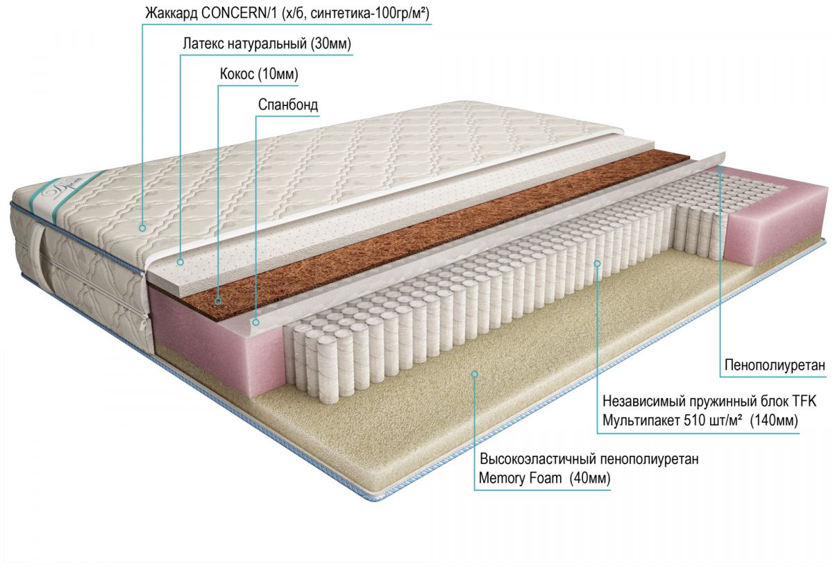 Обе стороны этого матраса средней жесткости. Одна сторона –это комбинация натурального латекса и кокосовой койры. А на другой стороне в качестве наполнителя использован мемориформ- современный материал, который тонко реагируя на вес и тепло человека и легко подстраивается, повторяя контуры тела. Он практически не оказывает давления на тело лежащего, фактически приобретая его форму. Кроме того, этот поролон обладает антимикробными свойствами. Пружинный блок «мультипакет», обеспечивает повышенный анатомический и oртопeдический эффект за счет большего количества пружин. Он состоит из отдельных независимых пружин, заключенных в тканевые чехлы. Приятная на ощупь матрасная ткань обладает высокой прочностью и долговечностью. Чехол съемный, имеет молнию по трем сторонам матраса. Плотная классическая полусинтетическая матрасная ткань с особым жаккардовым плетением, приятная на ощупь и безупречно устойчивая к истиранию. Мультипакет Мидл Мемори - это уникальная модель, которая совмещает в себе на