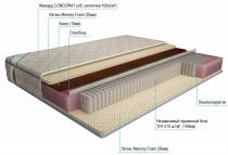 Матрас не симметричен по жесткости относительно пружинного блока, т.е. имеет две стороны разной жесткости. Одна сторона средняя с наполнителем кокос и Латекс Memory Foam, другая только Латекс Memory Foam - мягкая сторона. Латекс Memory Foam - современный материал, который тонко реагируя на вес и тепло человека и легко подстраивается, повторяя контуры тела. Он практически не оказывает давления на тело лежащего, фактически приобретая его форму. Кроме того, этот поролон обладает антимикробными свойствами. Преимущества Латекс Memory Foam - менее чувствительный к температуре окружающей среды и дает хорошую воздухопроницаемость. Кокосовое волокно (койра)-натуральный материал, обладает бактерицидным свойством, не гниет ни при какой влажности, не вызывает аллергических реакций. Пружинный блок «мультипакет», обеспечивает повышенный анатомический и oртопeдический эффект за счет большего количества пружин. Он состоит из отдельных независимых пружин, заключенных в тканевые чехлы. Матрас долговечен