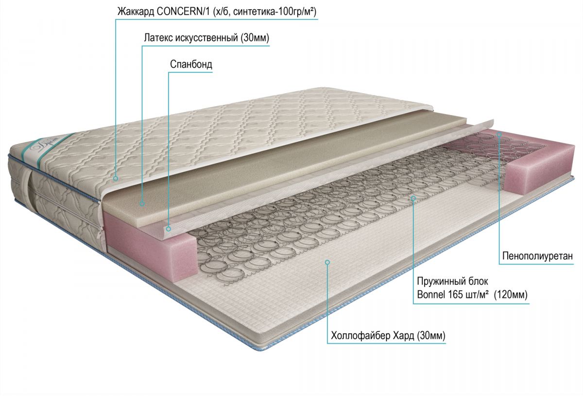 Матрас с классическим блоком пружин. Жесткость сторон разная благодаря использованию разных наполнителей. Первая сторона искусственный латекс- синтетический наполнитель, имеет повышенную эластичность, его устойчивость к воздействию внешней среды, термостабильность и экологичность делают этот материал идеальным наполнителем для мягких матрасов. Вторая сторона - Холлофайбер-Хард обладает низкой сорбционной способностью, не впитывает даже парообразной влаги. Не крошится, не дает усадки, легко крепится. Материалы обеспечивают повышенную упругость данной модели, обеспечивают отличную испаряемость влаги, обладают антибактериальным действием. Приятная на ощупь матрасная ткань обладает высокой прочностью и долговечностью. Чехол съемный, имеет молнию по трем сторонам матраса. Плотная классическая полусинтетическая матрасная ткань с особым жаккардовым плетением, приятная на ощупь и безупречно устойчивая к истиранию. Комплектация Основа -Пружинный блок Bonnel 165 шт/м2, высота: 12 см 1 с