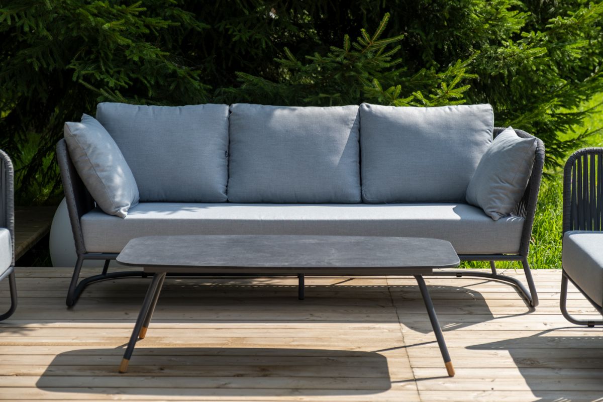 Лаунж-зона «Багамы» предназначена для размещения пяти персон. Она включает в себя:- трехместный диван (размер - 2000×800×735 мм).- два плетеных кресла (размер - 920×800×735 мм).- журнальный столик (размер - 1200×650×400 мм).Каркас уличной мебели выполнен из износостойкого алюминия. Его дополняет серая ручная оплетка, изготовленная на основе эластичных синтетических лент из полиэфирных волокон высокой прочности (роупа).Кресла и диван идут в комплекте с мягкими подушками в чехлах светло-серого цвета. "Багамы" диван 3-местный плетеный из роупа, каркас алюминий темно-серый (RAL7024) муар, роуп серый 15мм, ткань светло-серая 1шт. 2 000Х800Х735, "Багамы" кресло плетеное из роупа, каркас алюминий темно-серый (RAL7024) муар, роуп серый 15мм, ткань светло-серая 2шт. 920Х800Х735, "Верона" журнальный стол из HPL 120х65, H40, каркас черный муар, цвет столешницы "серый гранит" 1шт. 1 200Х650Х400,