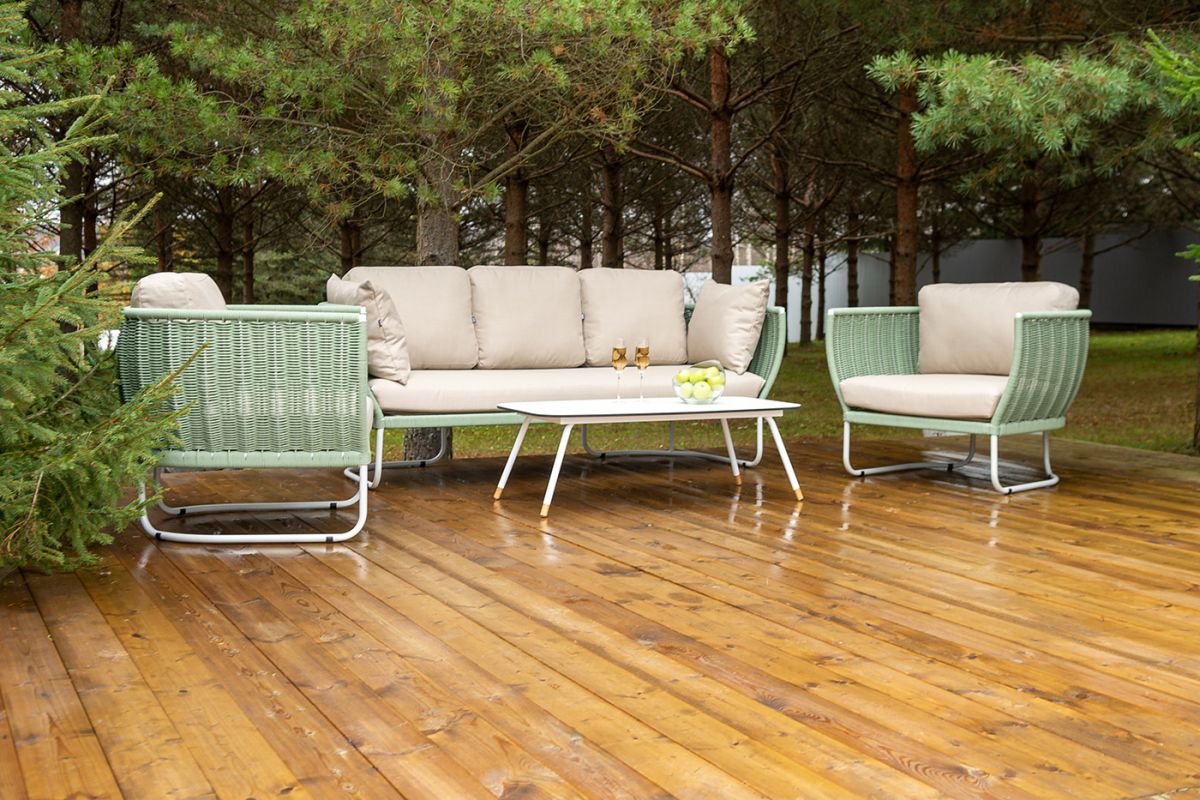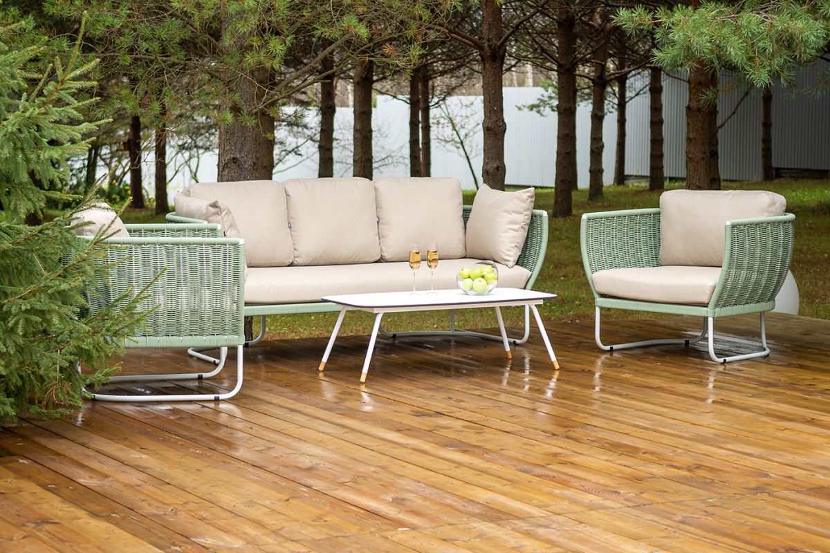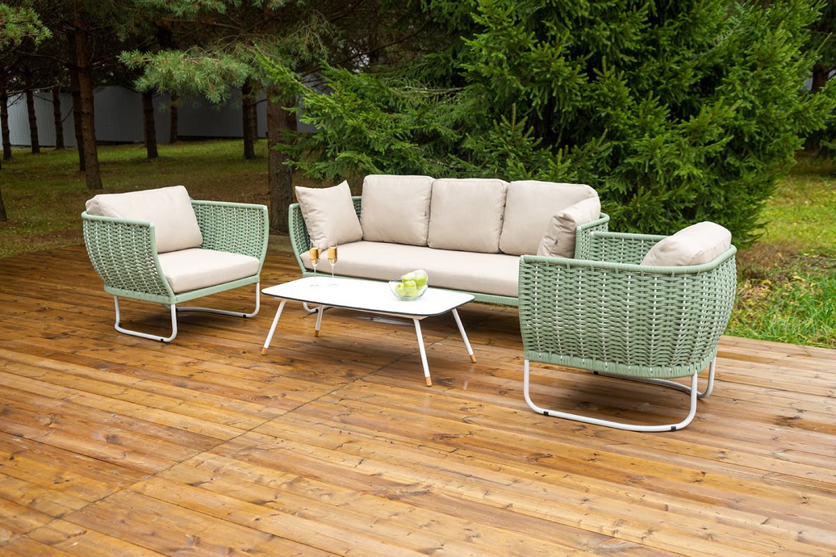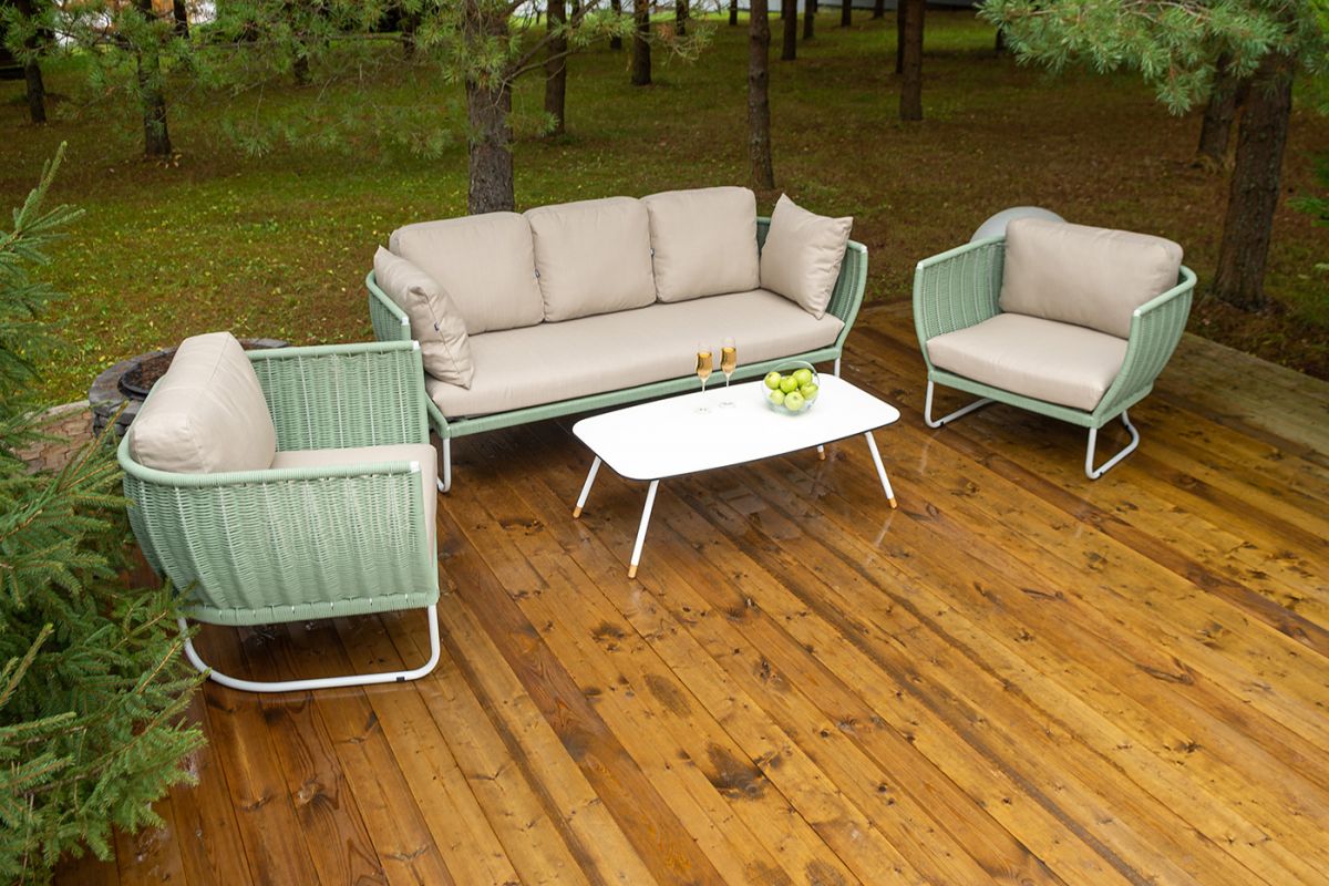 Лаунж-зона «Фиджи» — это готовое решение для уютного отдыха на террасе, в саду или на веранде. Комплект объединяет в себе практичность, стильный дизайн и комфорт.В лаунж-зону входят:- трехместный диван (2180×890×810 мм);- два плетеных кресла (1040×890×810 мм каждое);- журнальный столик (1200×650×400 мм).Каркас выполнен из износостойкого алюминия светло-серого цвета. Материал обеспечивает прочность, легкость и устойчивость к коррозии.Боковины дивана и кресел вручную оплетены зелеными синтетическими лентами из высокопрочных полиэфирных волокон. Плетение придает мебели выразительный облик и удачно дополняет цвет каркаса.В комплект входят мягкие подушки с бежевыми чехлами. Они создают уют и гармонично сочетаются с общей цветовой гаммой. "Фиджи" диван 3-местный плетеный из роупа, каркас алюминий светло-серый (RAL7035) муар, роуп зеленый (4204) круглый tex, ткань Mossle бежевая 1шт. 2 140Х900Х790, "Фиджи" кресло плетеное из роупа, каркас алюминий светло-серый (RAL7035) муар, роуп зеленый (42