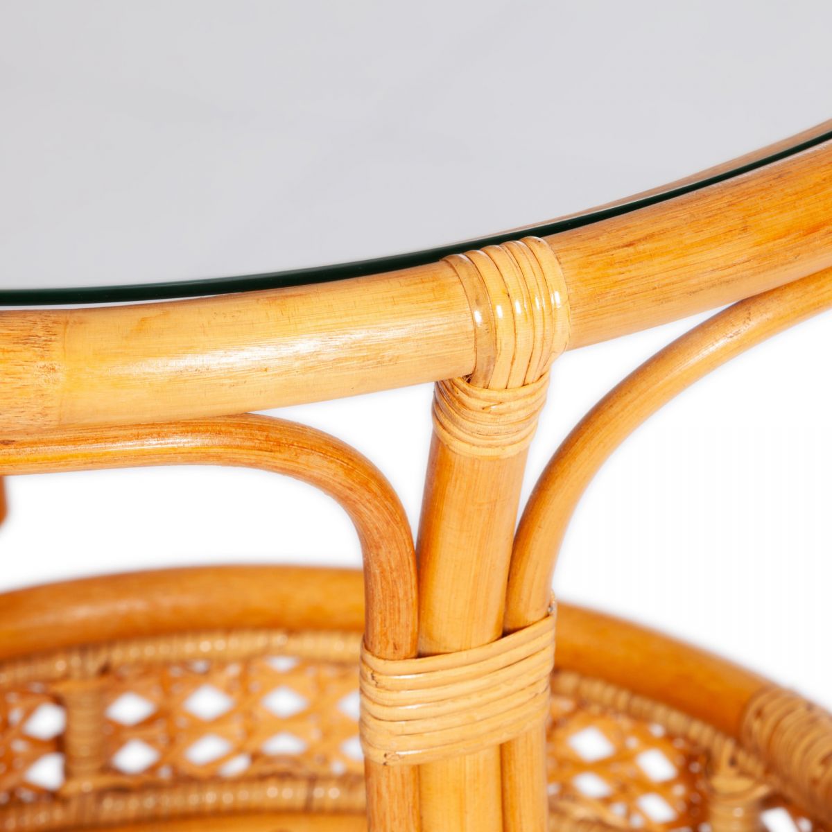 ротанг, кресло 65х65х77см, стол диаметр 64х61см, Honey (мед) Комплект PELANGI из натурального ротанга – это произведение искусства, созданное вручную мастерами с многолетним опытом. Метод выгибания и плетения ротанга делает каждый предмет неповторимым и уникальным. Ротанг – это натуральный материал, который отличается не только прочностью и долговечностью, но и экологичностью. Он не содержит вредных веществ и прекрасно вписывается в любой интерьер. Комплект из ротанга – это идеальное решение для тех, кто ценит комфорт и уют. Он лёгкий и мобильный, его легко перемещать по комнате. Комплект поставляется в собраном виде, что значительно упрощает его транспортировку. Комплект состоит из 4 кресел без подушек и стола со стеклом .