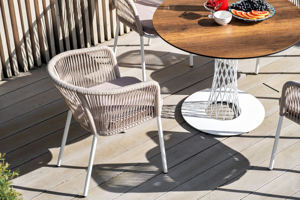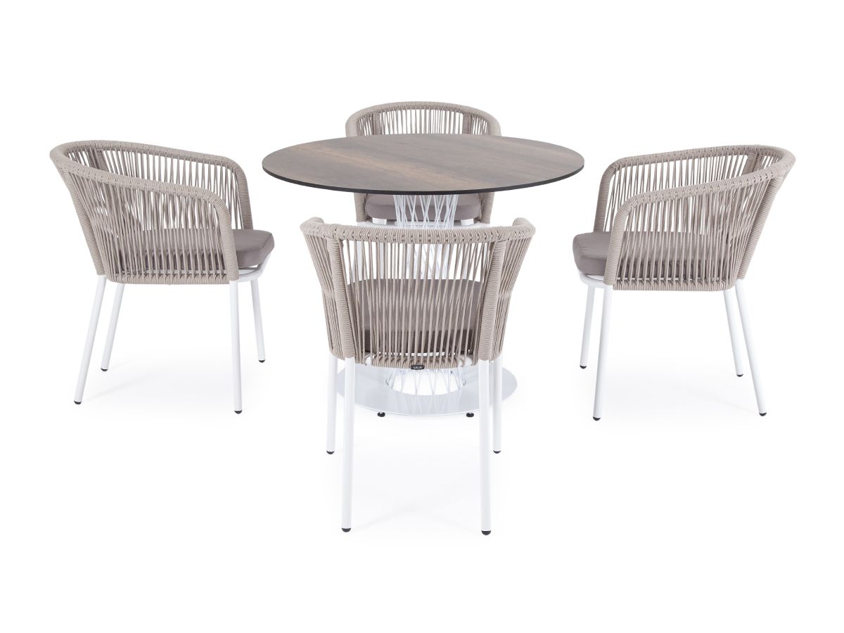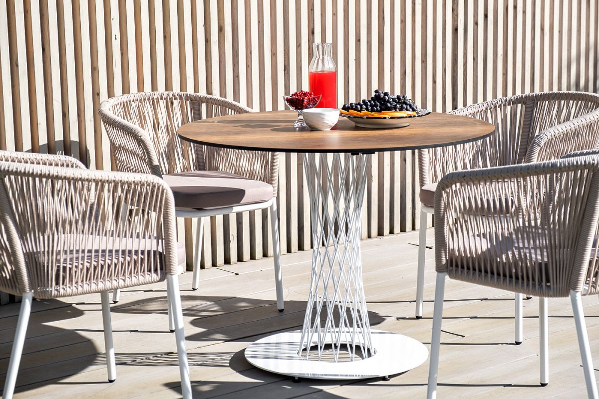 Обеденная группа "Диего" для интерьерных решений. Состоит из ккруглого обеденного стола со столешницей, диаметром 100 см. Материал столешницы выполнен из высококачественного монолитного компакт-пластика HPL в цвете "дуб". Подстолье - нержавеющая сталь белого цвета. 4 кресла из коллекции "Марсель", выполненных из алюминиевого каркаса и ручной оплетки роупом. Это эластичные синтетические ленты из высокопрочных полиэфирных волокон, представлены в бежевом цвете. В комплект также входят подушки с влагоотталкивающими съемными чехлами, цвет светло-серый. Возможно изготовление стола любого размера и формы по индивидуальному заказу. "Диего" обеденный стол из HPL круглый Ø100см, цвет "дуб", каркас черный 1шт. 1 000Х1 000Х750, "Марсель" стул плетеный из роупа, каркас алюминий белый шагрень, роуп бежевый круглый, ткань бежевая 4шт. 570Х620Х800,