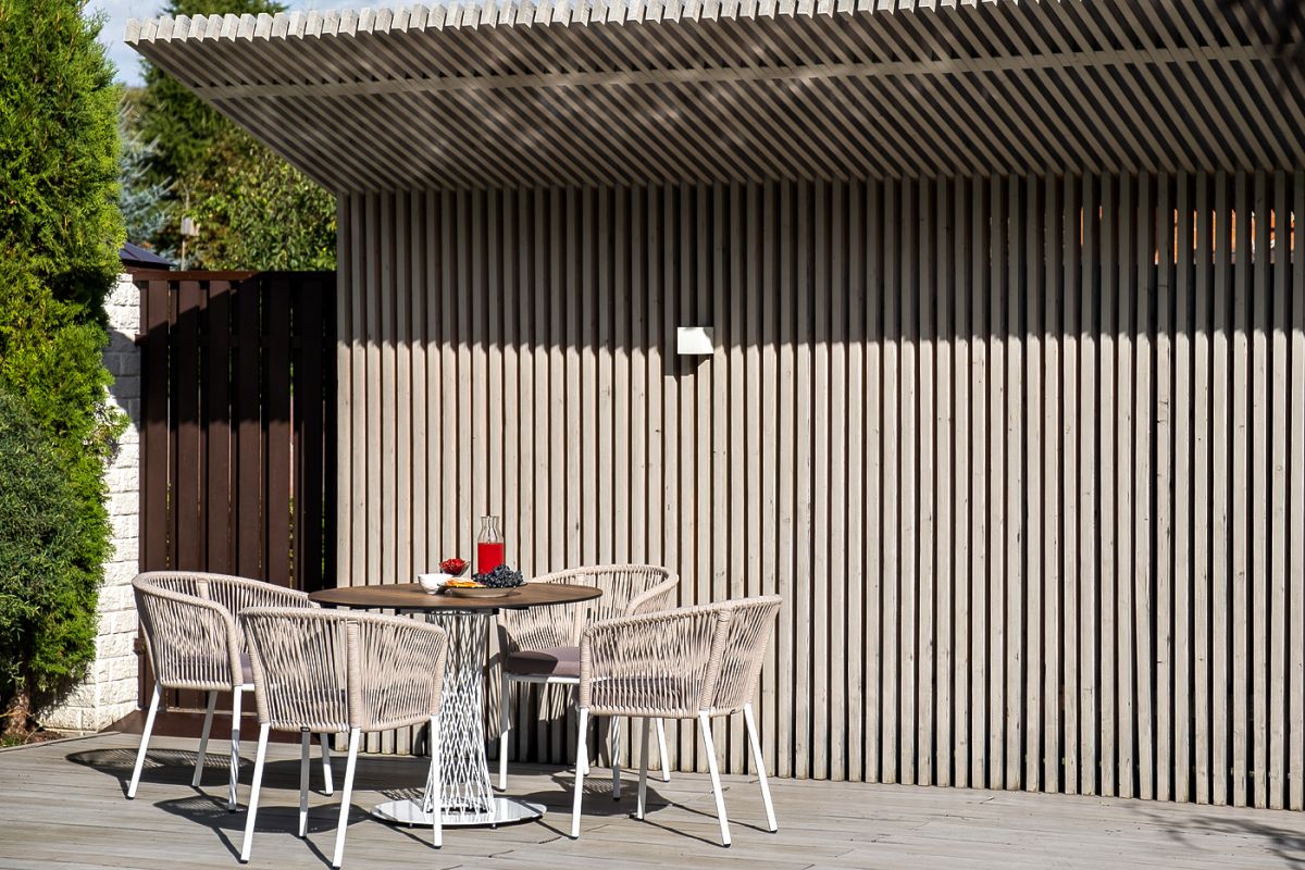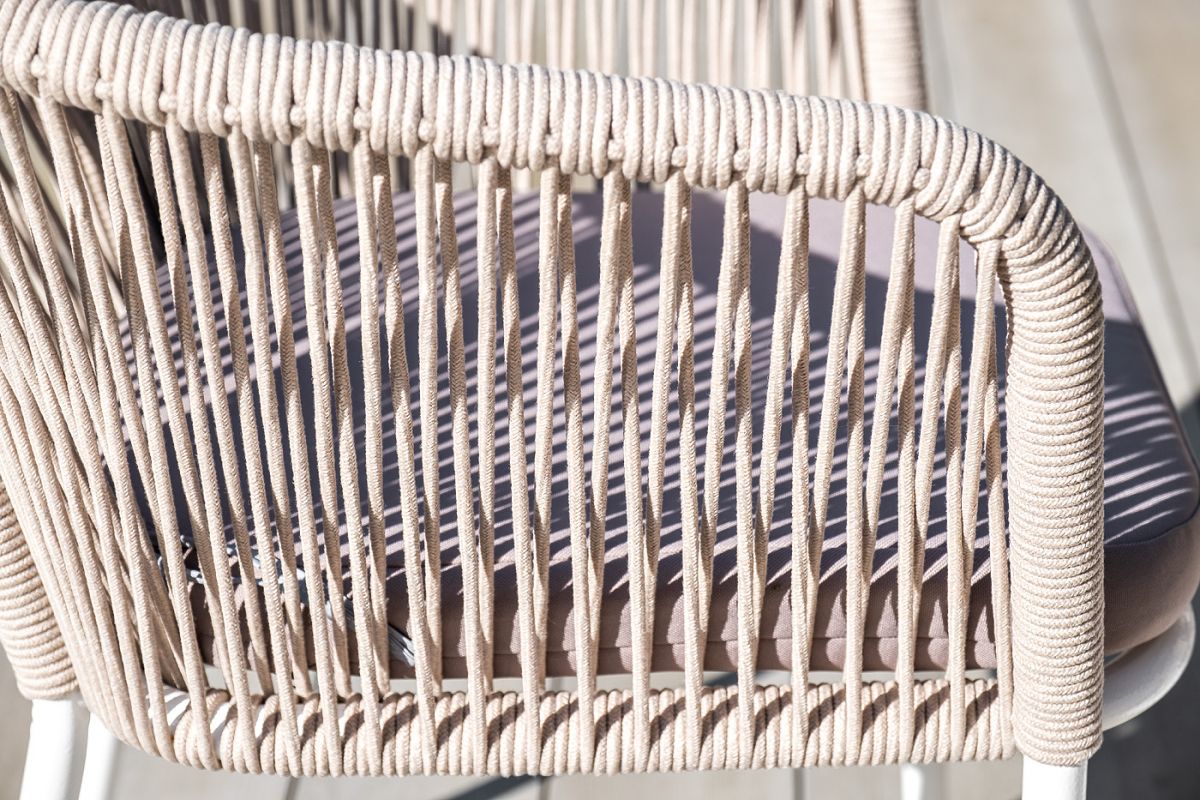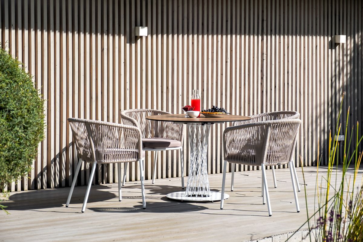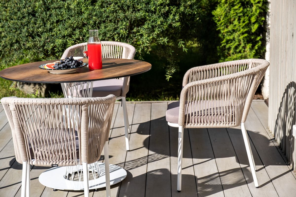 Обеденная группа "Диего" для интерьерных решений. Состоит из ккруглого обеденного стола со столешницей, диаметром 100 см. Материал столешницы выполнен из высококачественного монолитного компакт-пластика HPL в цвете "дуб". Подстолье - нержавеющая сталь белого цвета. 4 кресла из коллекции "Марсель", выполненных из алюминиевого каркаса и ручной оплетки роупом. Это эластичные синтетические ленты из высокопрочных полиэфирных волокон, представлены в бежевом цвете. В комплект также входят подушки с влагоотталкивающими съемными чехлами, цвет светло-серый. Возможно изготовление стола любого размера и формы по индивидуальному заказу. "Диего" обеденный стол из HPL круглый Ø100см, цвет "дуб", каркас черный 1шт. 1 000Х1 000Х750, "Марсель" стул плетеный из роупа, каркас алюминий белый шагрень, роуп бежевый круглый, ткань бежевая 4шт. 570Х620Х800,