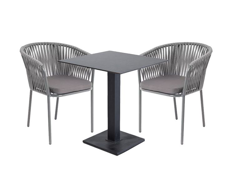 Обеденная группа «Каффе» рассчитана на 2 персоны.В состав комплекта входят:- стол со столешницей из HPL-пластика - 640×640×750 мм.- двух стульев «Бордо» - 570×620×775 мм.Интерьерный стол изготовлен из чугунного подстолья, окрашенного в черный цвет, и столешницы из компактного пластика HPL в цвете «серый гранит». Благодаря массивному основанию столик устойчив на любых поверхностях.Стулья оснащены алюминиевым каркасом, которые вручную оплетены плоским роупом серого цвета.