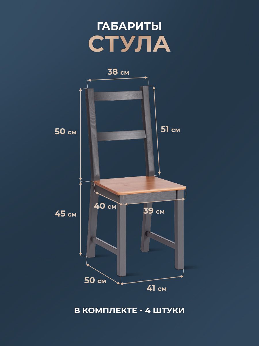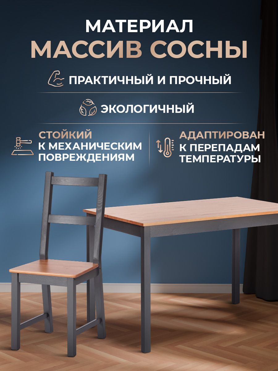 массив сосны, стол: 120х75х73см стул :41х50х95см, антик /графит Обеденный комплект Соната из Дельфийской коллекции — это стильный и функциональный элемент интерьера вашей кухни или столовой. В комплект входят стол и четыре стула с прочным и долговечным каркасом из массива сосны. Античный оттенок столешницы и сидений стульев в сочетании с графитовым цветом придаёт интерьеру элегантность. Этот комплект будет хорошо смотреться как в городской квартире, так и в загородном доме, в столовой или на кухне, на террасе или веранде. Он позволяет разместить до четырёх человек и подходит для комфортного и длительного времяпрепровождения. Мебель поставляется в разобранном виде и легко собирается согласно инструкции.