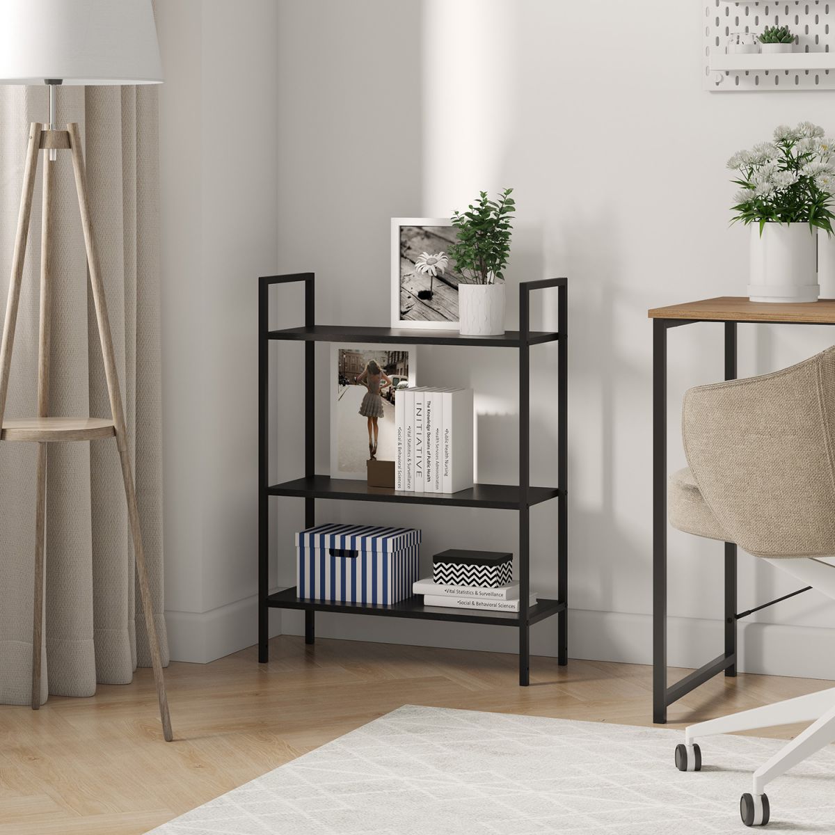 Простой и стильный стеллаж Leset Стилвуд с тремя полками — надежный помощник в доме и офисе. Каркас выполнен из металлического профиля 1,5 см (толщина 0,1 см) с прочным порошковым покрытием: устойчив к коррозии и сколам, держит форму. Полки из ЛДСП 1,6 см — лёгкий уход, устойчивость к царапинам, каждая выдерживает до 20 кг. Нижняя полка имеет возможность крепления на разных высотах, поэтому стеллаж легко подстроить под книги, технику или корзины. Маленькая плоская упаковка — легко нести в руках и удобно хранить до сборки. Универсальный минималистичный дизайн с открытой рамой встраивается в любой интерьер; доступно 4 декора полок: чёрный, дуб крафт, орех и белый, а каркас — в белом или чёрном. Практично, надёжно и аккуратно.