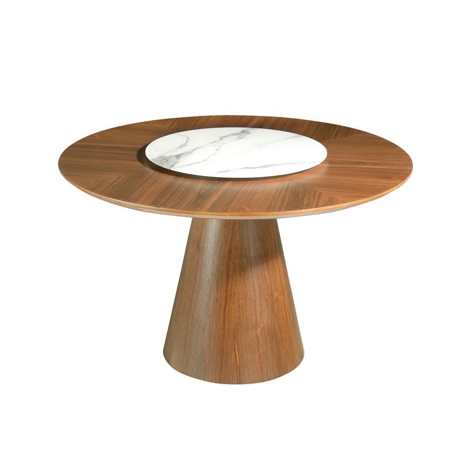 Обеденный стол BRT1702-2 от фабрики фабрики Angel Cerda — дерево и камень, идеально смотрящиеся вместе.Стол заинтересует каждого, кто любит и ищет необычные предметы интерьера. Здесь привлекают внимание сразу две дизайнерские задумки — конусная стойка и центральная часть столешницы, сделанная из керамики с имитацией мрамора. Удивительные особенности этой модели сделают стол центром притяжения взглядов и восхищений. Стол сделан полностью из натуральных материалов. Столешница, как и ножка, произведена из шпонированного МДФ высокого качества. Дизайнеры ей придали необычный вид — круг визуально разделен на четыре сектора, каждый из которых имеет разный орнамент. Сверху по желанию можно уложить мраморную подставку. Этот декоративный элемент светло-серого цвета, служит для выделения центральной части столешницы и создания дополнительного акцента на столе в целом.Конусообразная нога имеет широкое основание, поэтому гарантирует высокую устойчивость, даже при сильных весовых нагрузках. Она такж