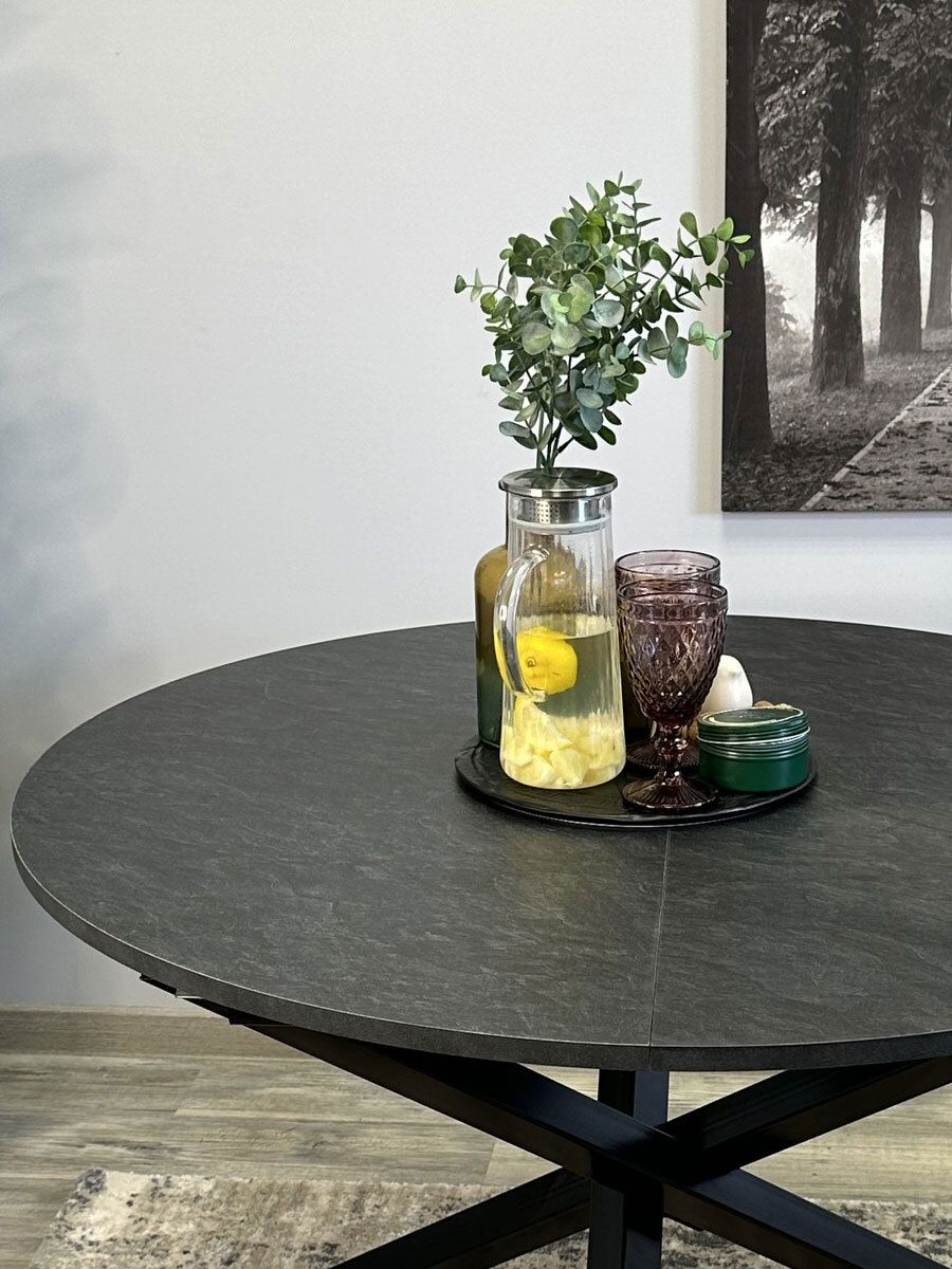 Стол, уникальный во всём, от трёх необычных опор до новейшего ЛДСП Egger Premium 2024. Хороший размер для семьи из 5-6 человек, т.к. остается максимальное пространство для ног и можно поставить 5-6 стульев даже в сложенном виде ОСНОВНЫЕ ПРЕИМУЩЕСТВА Стол с круглой столешницей из ЛДСП Egger Premium 2024, надежными опорами из необычного профиля квадратного сечения и самой удобной системой раздвижения. Столешница премиум-класса Столешница из ЛДСП Egger Premium 2024, это сверх реалистичный декор высокой четкости, глубокий, с прорисованными деталями. Используется специальное покрытие Филвуд, которое делает его неотличимым от натурального. Используется технология "Синхропора", когда углубления и выступы идеально совпадают с декором.  Высокая надежность материалов Три опоры из необычного профиля квадратного сечения формируют интересный вешний вид стола, делают его стильным и при этом очень устойчивым. Цвет Гарантия 24 месяца.