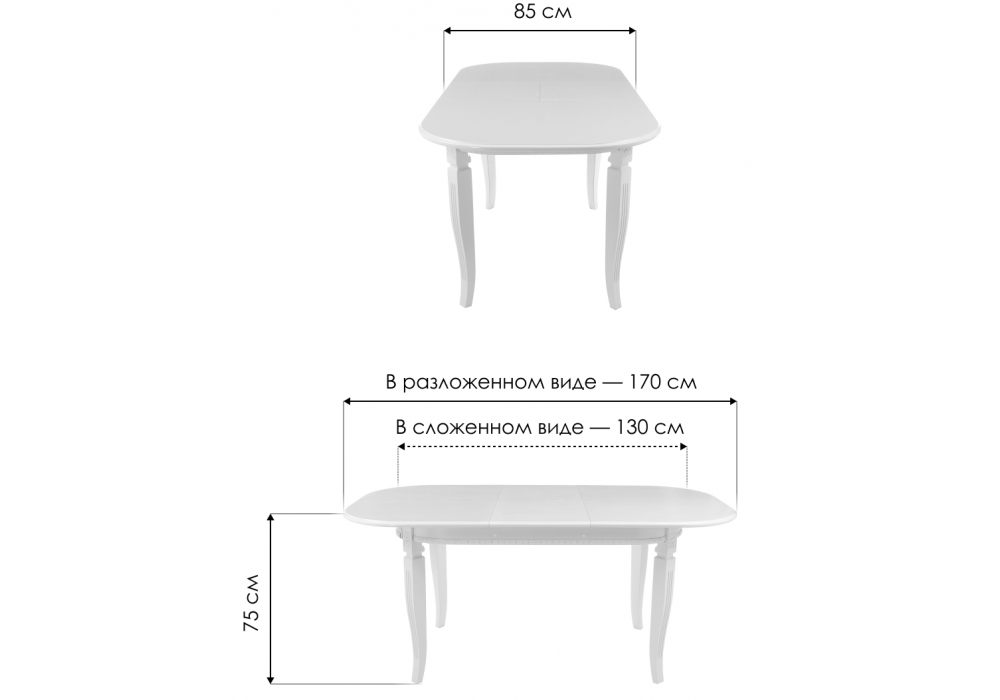 Размер: Длина (см): 130-170 Ширина (см): 85 Высота (см): 75 Материал: Массив бука Цвет: Молочный Производитель: Россия