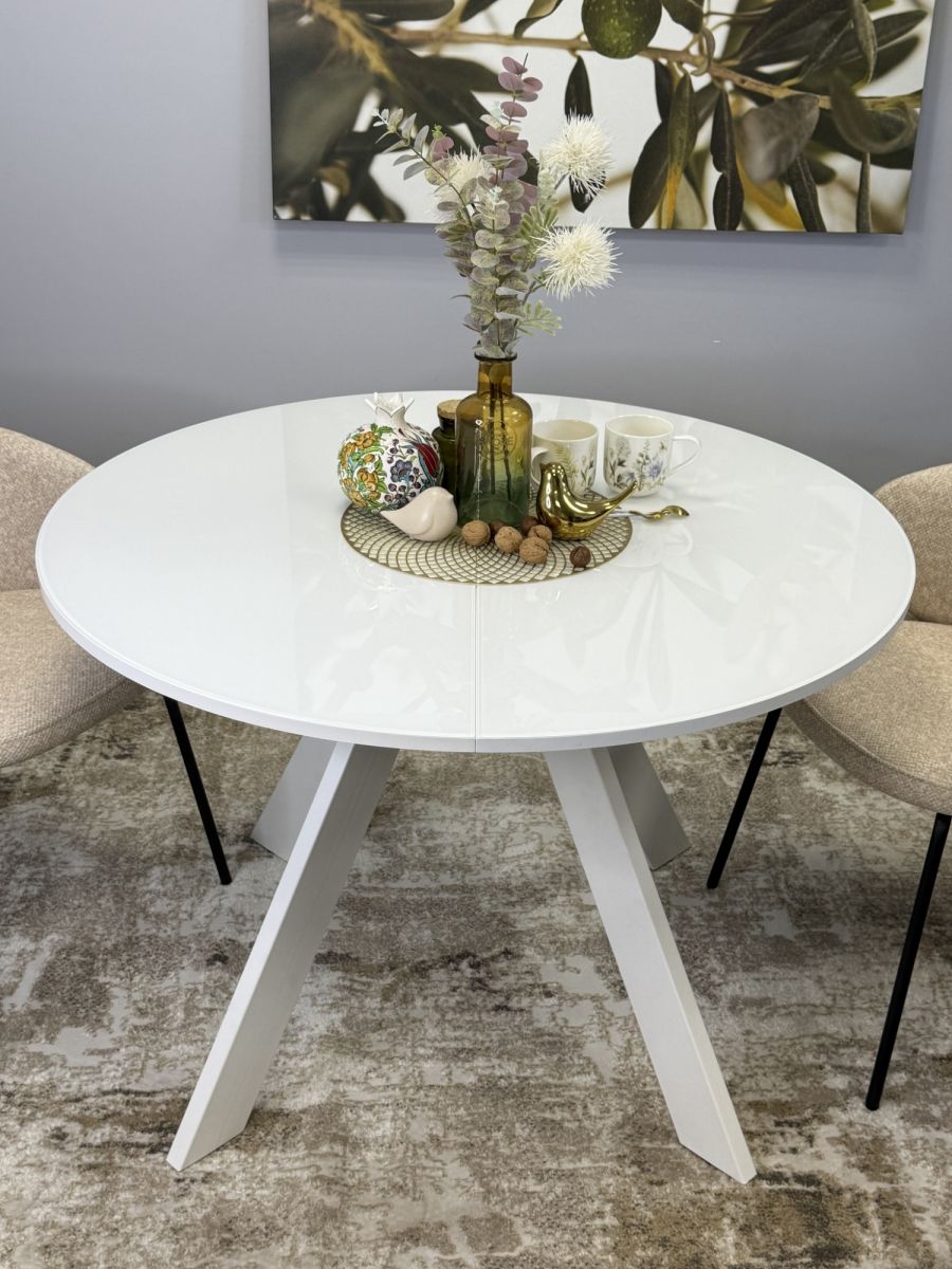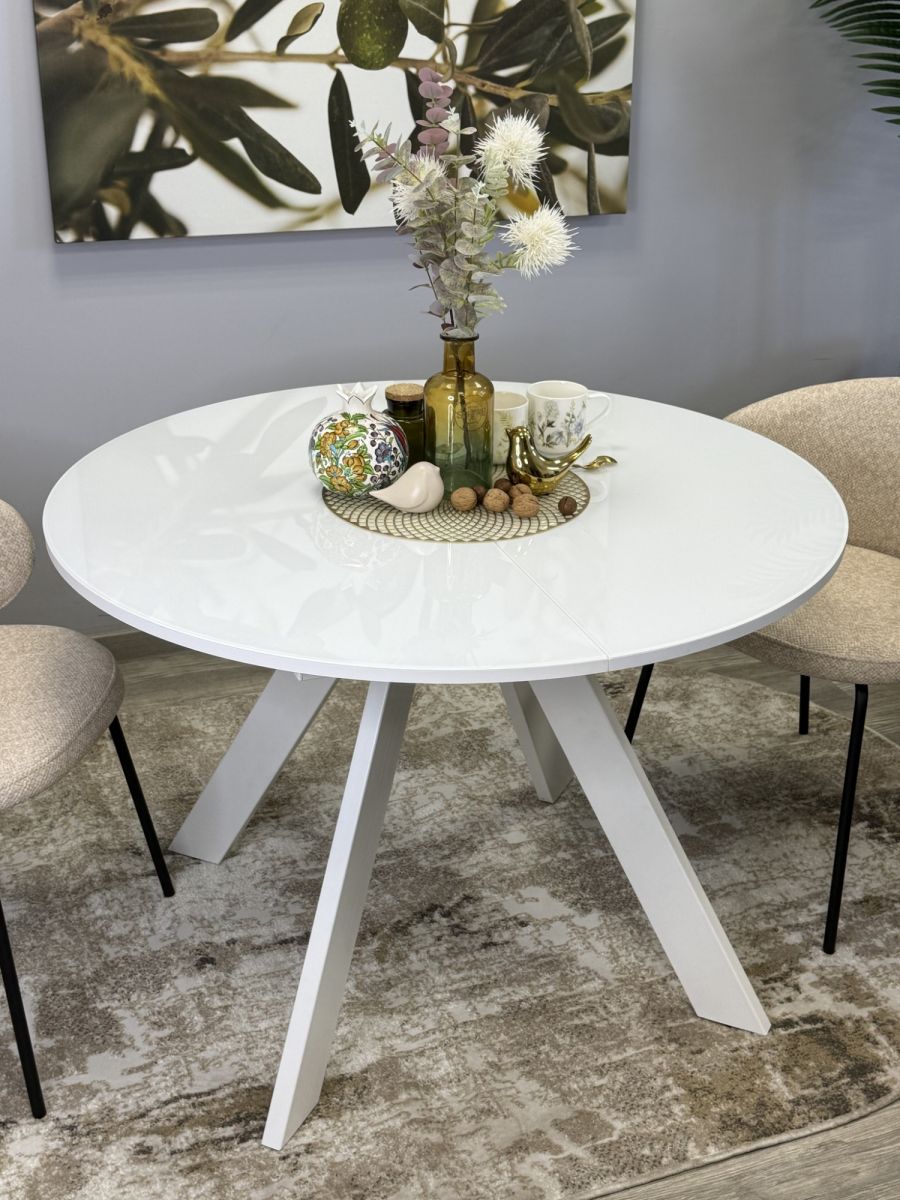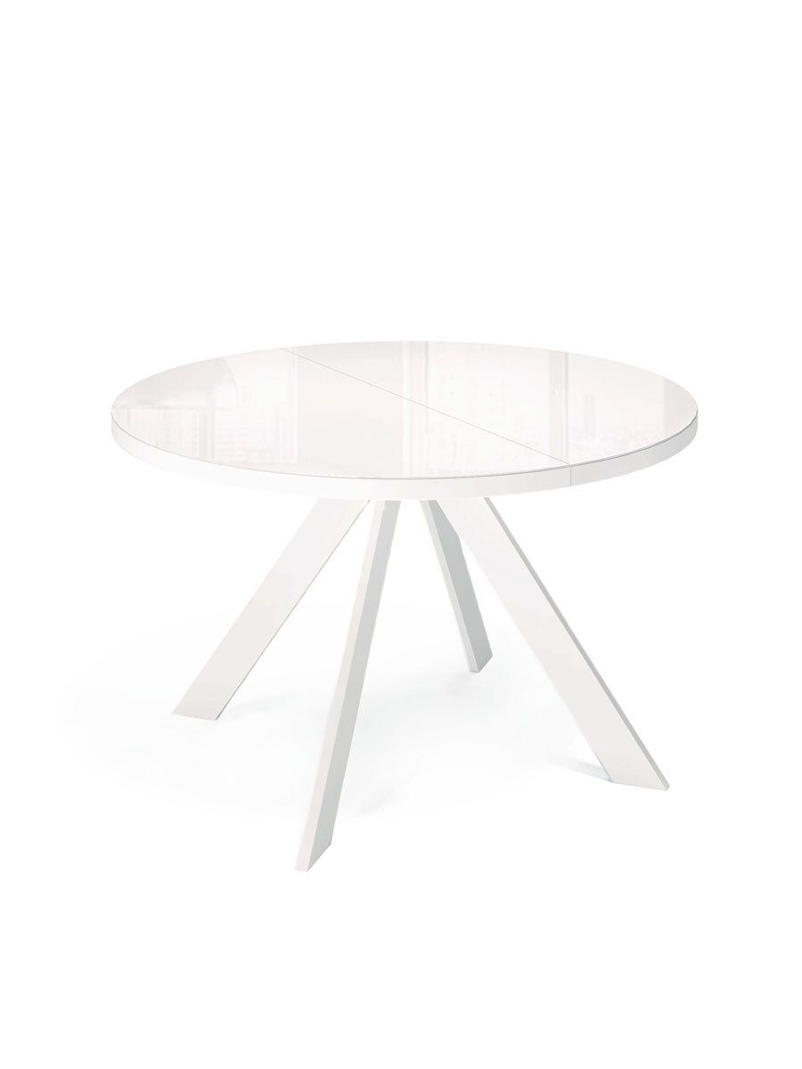 Стол KENNER RL1100 цвет белый, столешница - стекло белое, глянец. Стильные, дизайнерские столы для дома. Фабрика "Кеннер". Гарантия качества. Быстрая доставка по РФ. Стол на центральной опоре немного напоминает летающую тарелку. Это один из самых удобных круглых столов которые Вы можете купить в России. Широкий разлет опор позволяет поставить любые, самые широкие кресла к столу. Оптимальный размер позволяет удобно разместить 4 чел за столом в сложенном состоянии и 6-8 в разложенном. Толстая, надежная столешница и металлическая рама, которая позволяет работать механизму раскладки легко и четко как часы. ОСНОВНЫЕ ПРЕИМУЩЕСТВА  Круглый стол оптимального размера. Диаметр 1100мм позволяет и комфортное размещение 4 человек для постоянного использования и организацию места для гостей и при этом стол не занимает много места.   Столешница премиум-класса Круглая столешница диаметром 1100мм смотрится солидно и очень качественно выполнена. Толщина столешницы 36мм, поверхность за