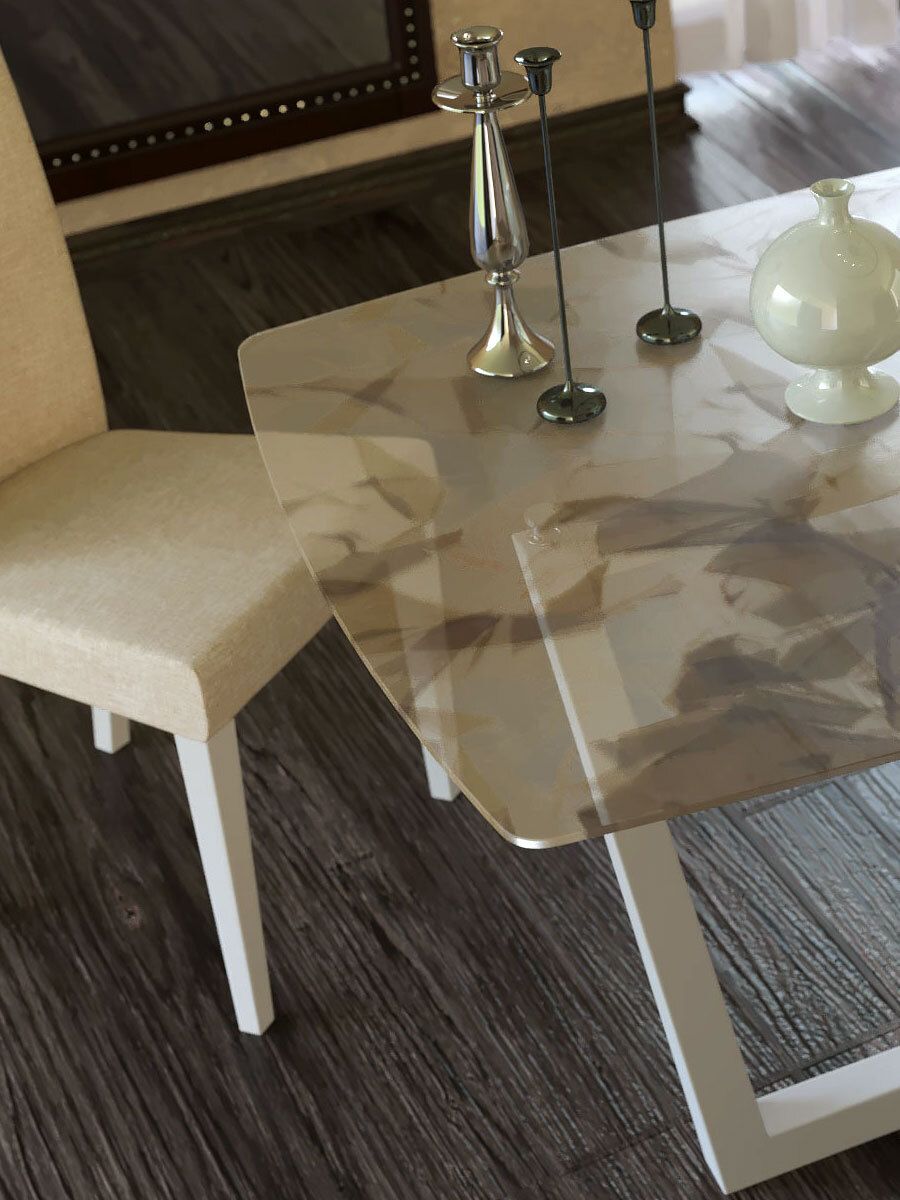 Уникальная техника совмещения стекла и ткани создает эффект 'скатерти'. Поверхность выполнена из 2-х слоев триплекса толщиной 6 мм каждый, между которыми проложена натуральная ткань со стильным рисунком в песочных тонах. Создается ощущение, что стол покрыт дорогой скатертью, на которую нельзя пролить ни капли. Поверхность не боится влаги, средств бытовой химии, соприкосновений с горячими и металлическими предметами. Эффект 'скатерти' не позволяет видеть ни царапин, ни отпечатков пальцев. Подстолье с ножками, выполненными в форме двух перекрещивающихся трапеций, изготовлено из массива бука, окрашенного в белый цвет. Натуральное дерево влагоустойчиво, не рассыхается от времени и не растрескивается при перепадах температур. Поверхность окрашивается способом, позволяющим подчеркнуть благородную текстуру материала Цвет Гарантия 24 месяца.