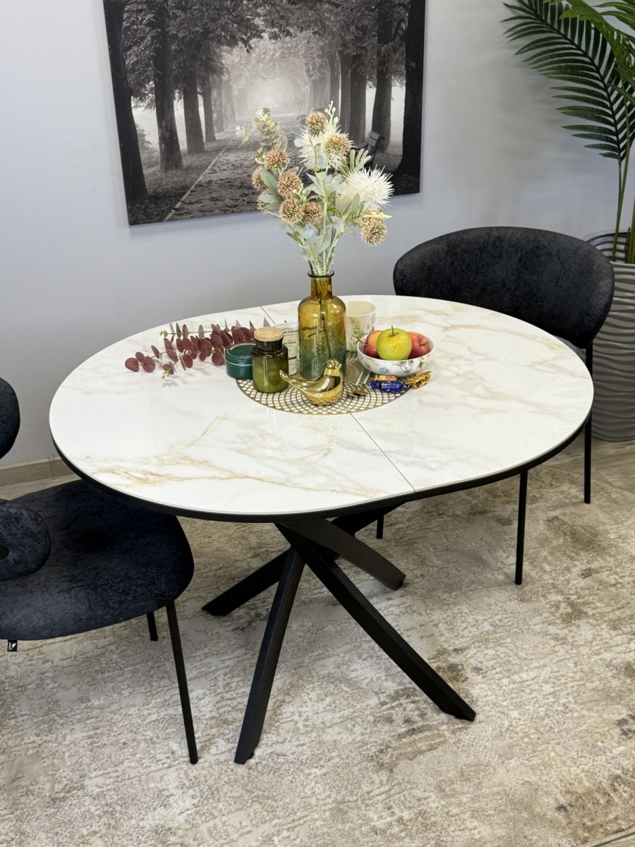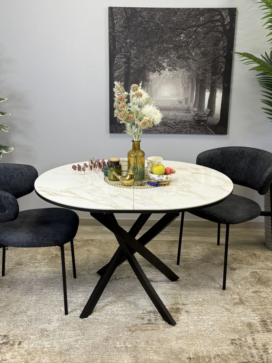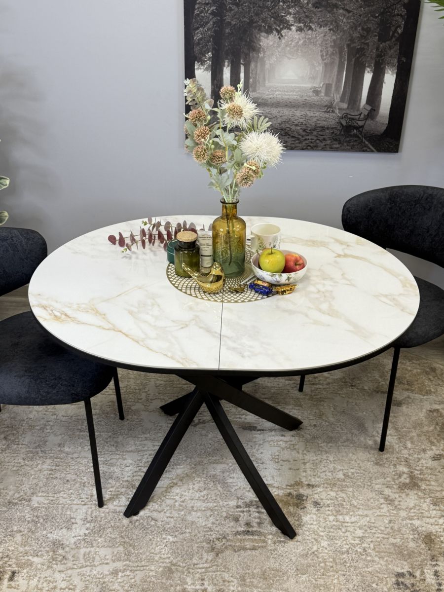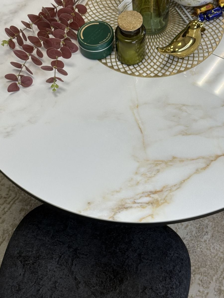 Ключевой особенностью этого стола является керамическая поверхность диаметром 110 см и долговечным, стабильным основанием. Дополняет комплект вставка на 30 см, расширяющая площадь стола.. ОСНОВНЫЕ ПРЕИМУЩЕСТВА Стол сконструирован так, чтобы идеально подходить семье из трех-четырех человек. Керамическая столешница устойчива к воздействию различных домашних неприятностей. Благодаря керамической вставке есть возможность увеличивать размер стола при необходимости. Столешница премиум-класса Керамическая продукция толщиной 5,6 мм отличается высокой стойкостью к царапинам, способна выдержать экстремально высокие температуры, обладает водоотталкивающими свойствами и устойчивостью к воздействию бытовой химии, а также сохраняет свой первоначальный цвет на протяжении всего срока эксплуатации. Высокая надежность материалов Центральное основание спроектировано так, чтобы не создавать помех при посадке. Столешница надежно закреплена и обеспечивает стабильность конструкции.