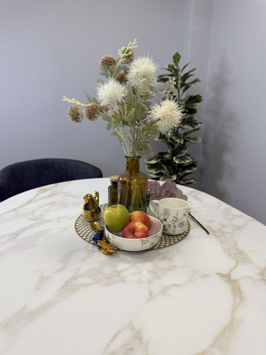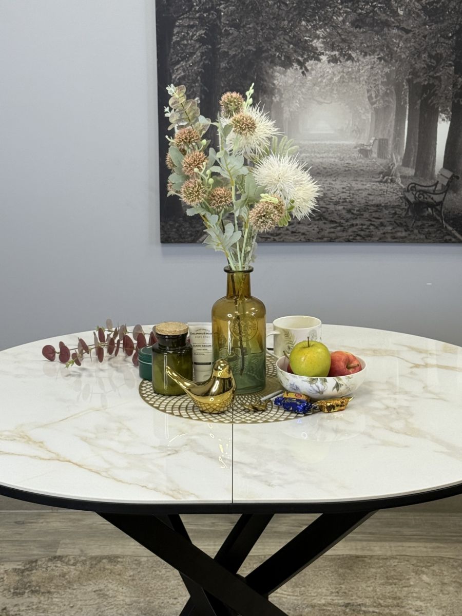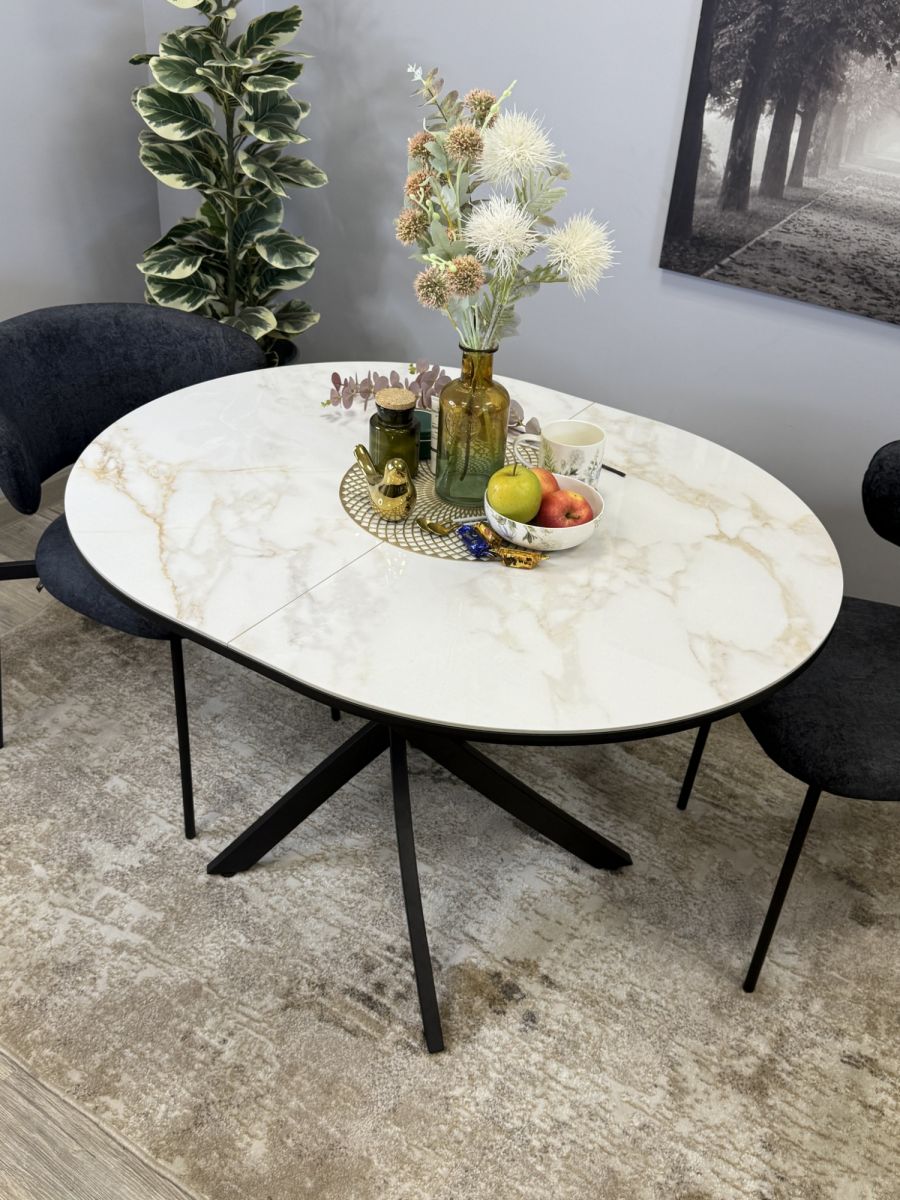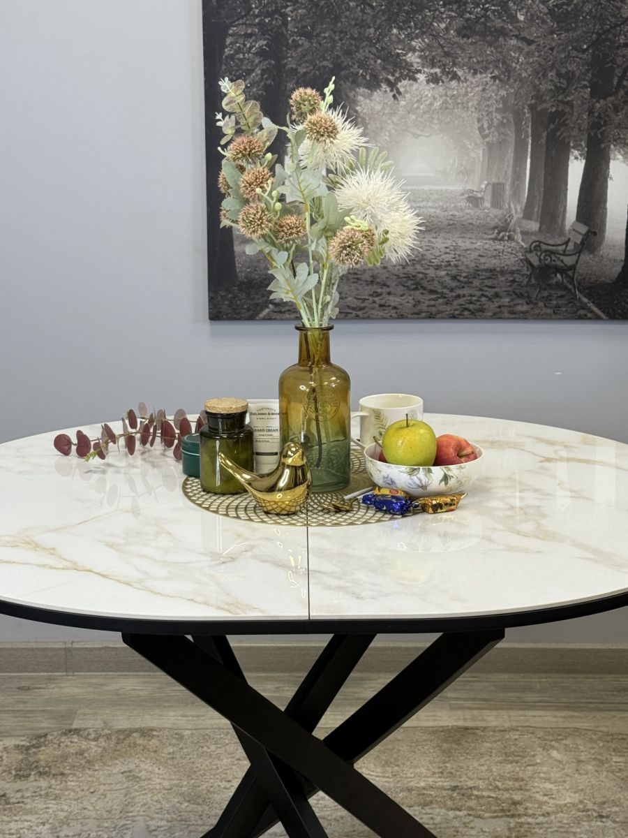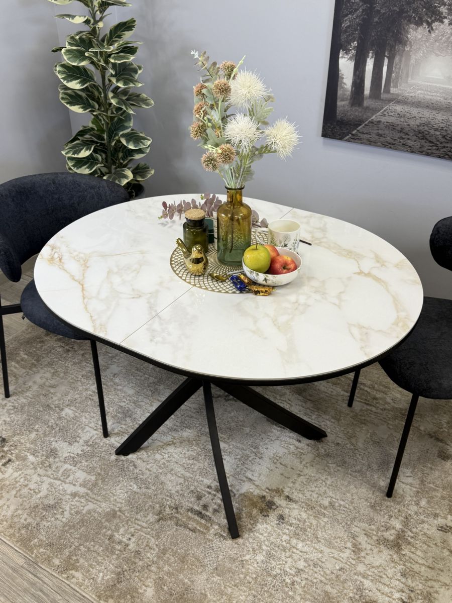 Ключевой особенностью этого стола является керамическая поверхность диаметром 110 см и долговечным, стабильным основанием. Дополняет комплект вставка на 30 см, расширяющая площадь стола.. ОСНОВНЫЕ ПРЕИМУЩЕСТВА Стол сконструирован так, чтобы идеально подходить семье из трех-четырех человек. Керамическая столешница устойчива к воздействию различных домашних неприятностей. Благодаря керамической вставке есть возможность увеличивать размер стола при необходимости. Столешница премиум-класса Керамическая продукция толщиной 5,6 мм отличается высокой стойкостью к царапинам, способна выдержать экстремально высокие температуры, обладает водоотталкивающими свойствами и устойчивостью к воздействию бытовой химии, а также сохраняет свой первоначальный цвет на протяжении всего срока эксплуатации. Высокая надежность материалов Центральное основание спроектировано так, чтобы не создавать помех при посадке. Столешница надежно закреплена и обеспечивает стабильность конструкции.