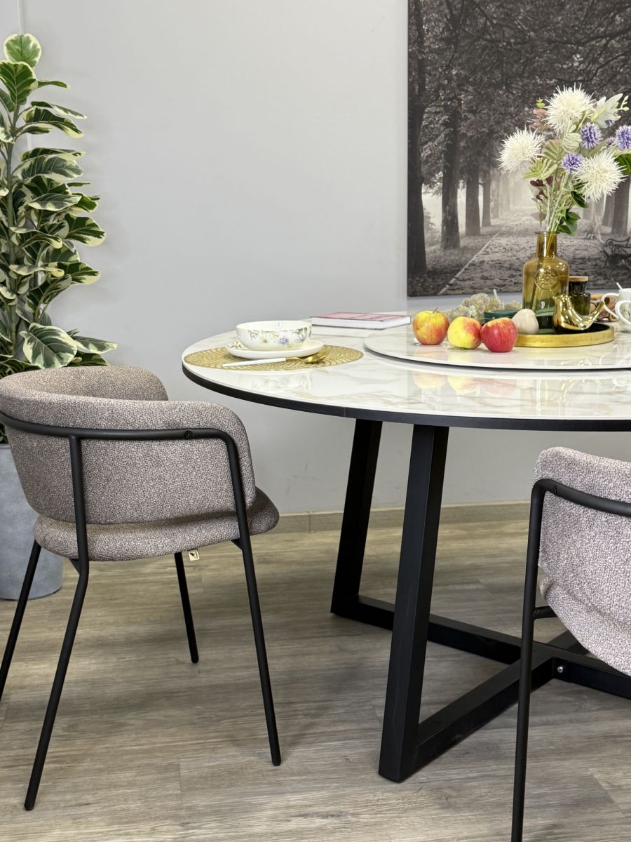 Круглый стол с уникальным механизмом поворотного центра стола, сделанный с керамикой которая защищает стол от любого внешнего воздействия, а опоры выполнены крестообразной формой, что к столу удобно сесть с любой стороны ОСНОВНЫЕ ПРЕИМУЩЕСТВА Большой, роскошный, удобный и очень практичный стол с оптимальной формой столешницы и очень надежным основанием Столешница премиум-класса Большая двухсоставная столешница круглой формы, выполненная из высококачественной керамики, обеспечивает повышенную прочность и долговечность. Благодаря устойчивости к механическим повреждениям и термошокам, она идеально подходит для интенсивной эксплуатации.  Высокая надежность материалов У стола KENNER SK1800 предусмотрена максимально удобная крестообразная опора из усиленного металлического профиля высокой прочности. Это решение обеспечивает устойчивость конструкции даже при значительных нагрузках и исключает риск прогибания столешницы. Цвет черный/керамика мрамор белый Гаранти