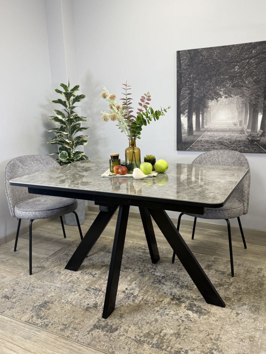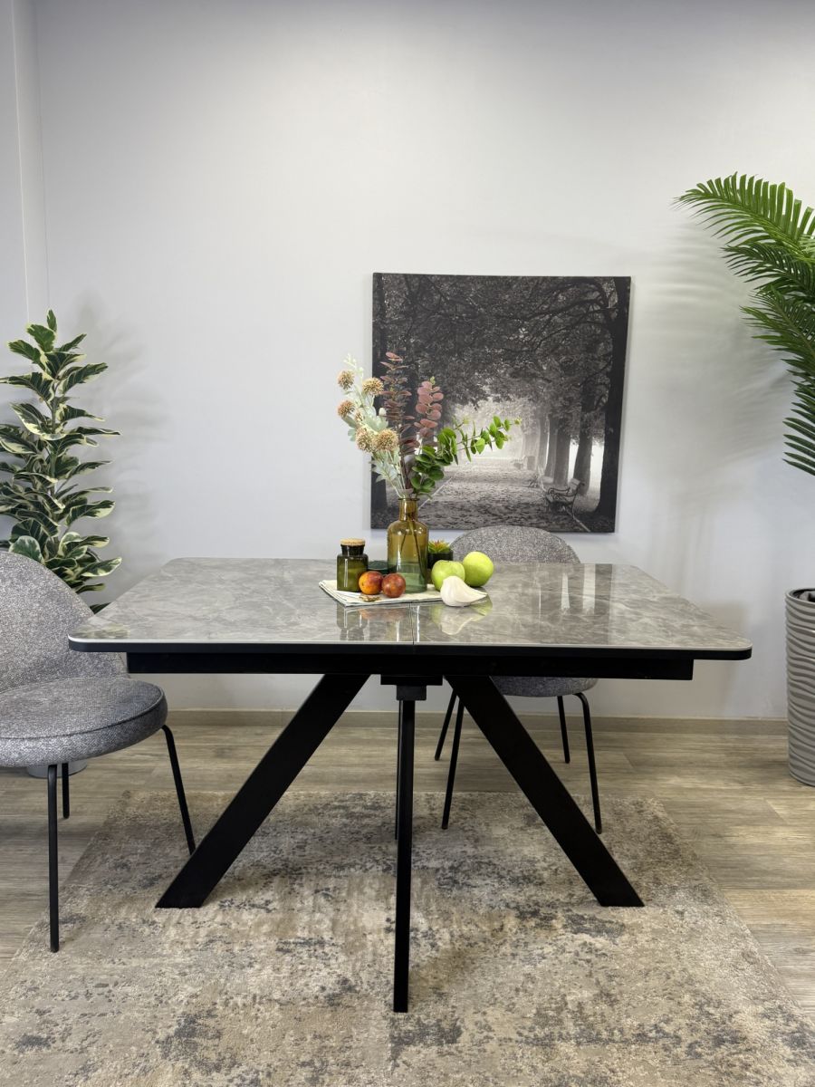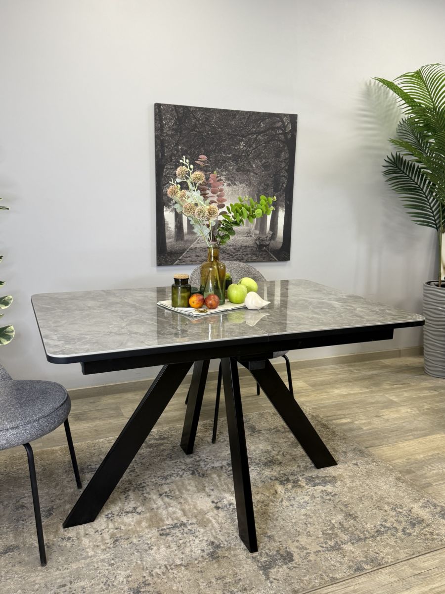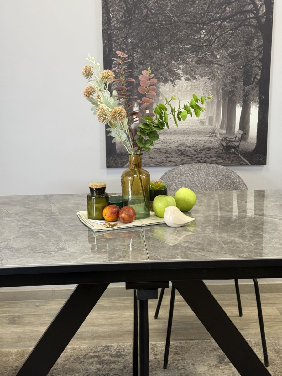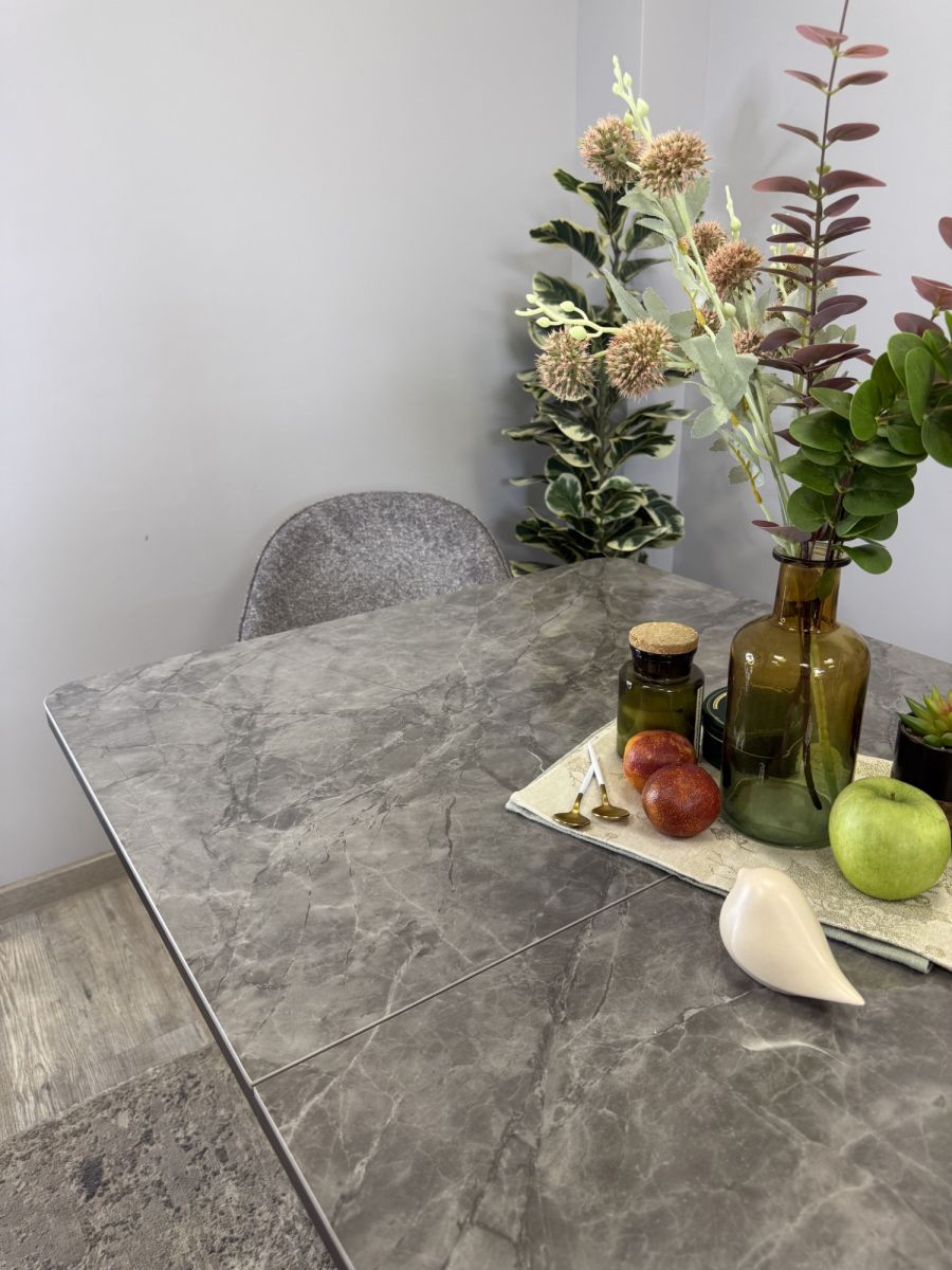 Стол с глянцевой керамикой и очень удобной центральной опорой, которая развернута таким образом, чтобы без помех ставить рядом 2 широких стула. Опора не мешает сидеть, а полностью скругленная столешница делает стол безопасным Цвет черный/керамика мрамор серый глянец Гарантия 24 месяца.