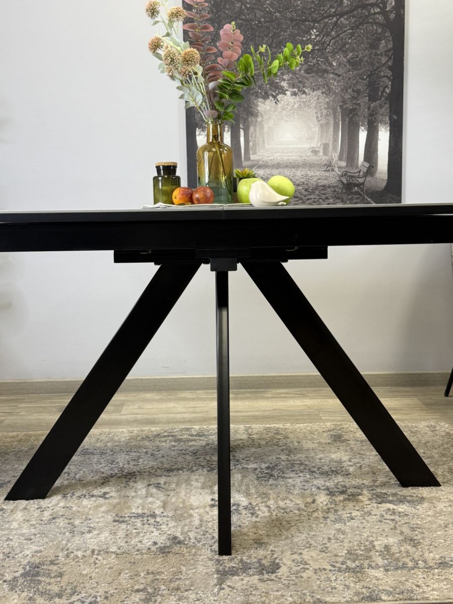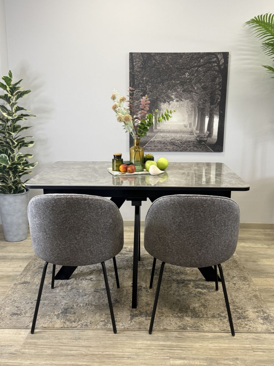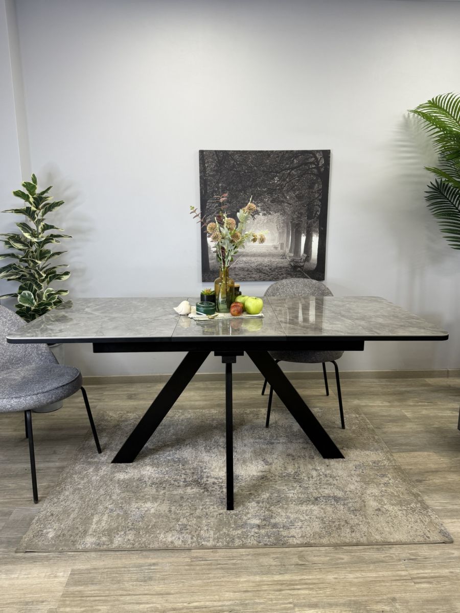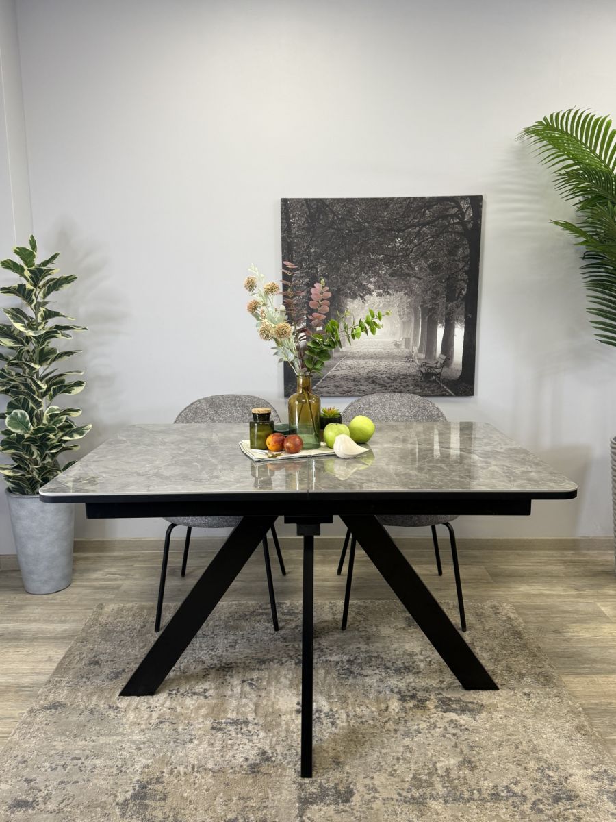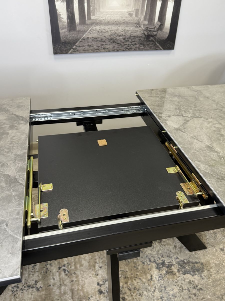 Стол с глянцевой керамикой и очень удобной центральной опорой, которая развернута таким образом, чтобы без помех ставить рядом 2 широких стула. Опора не мешает сидеть, а полностью скругленная столешница делает стол безопасным Цвет черный/керамика мрамор серый глянец Гарантия 24 месяца.