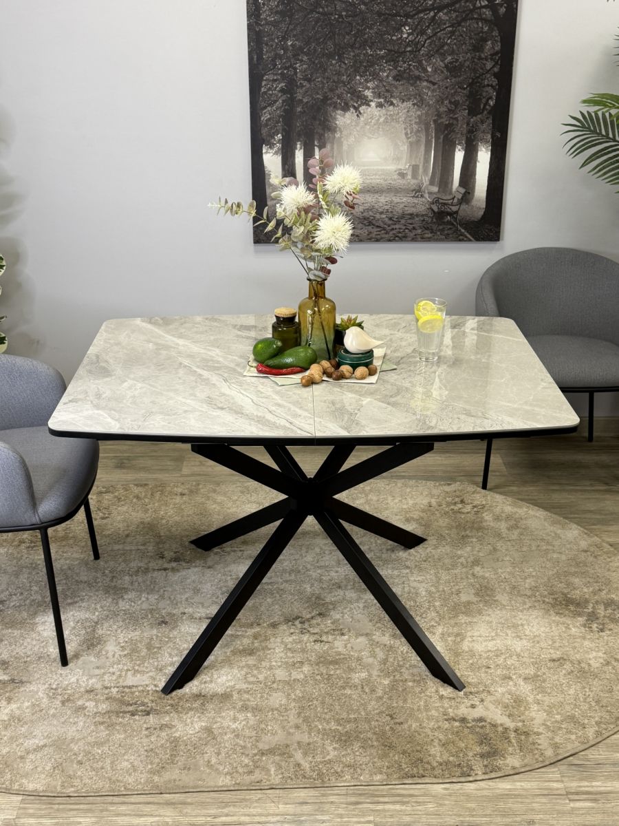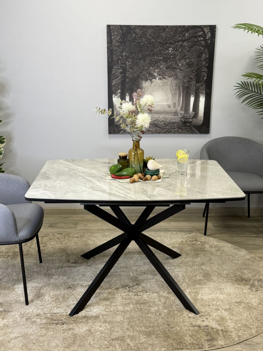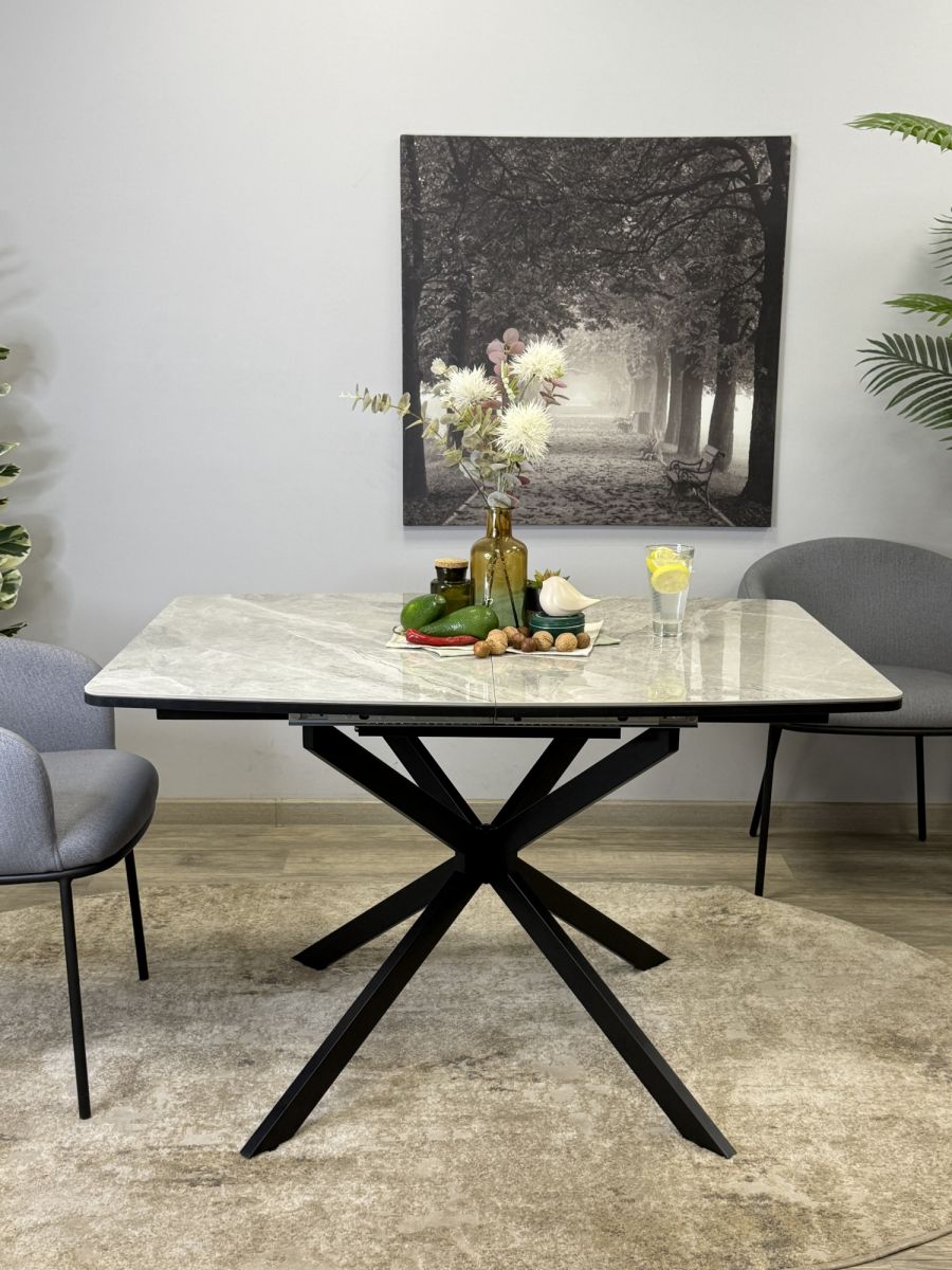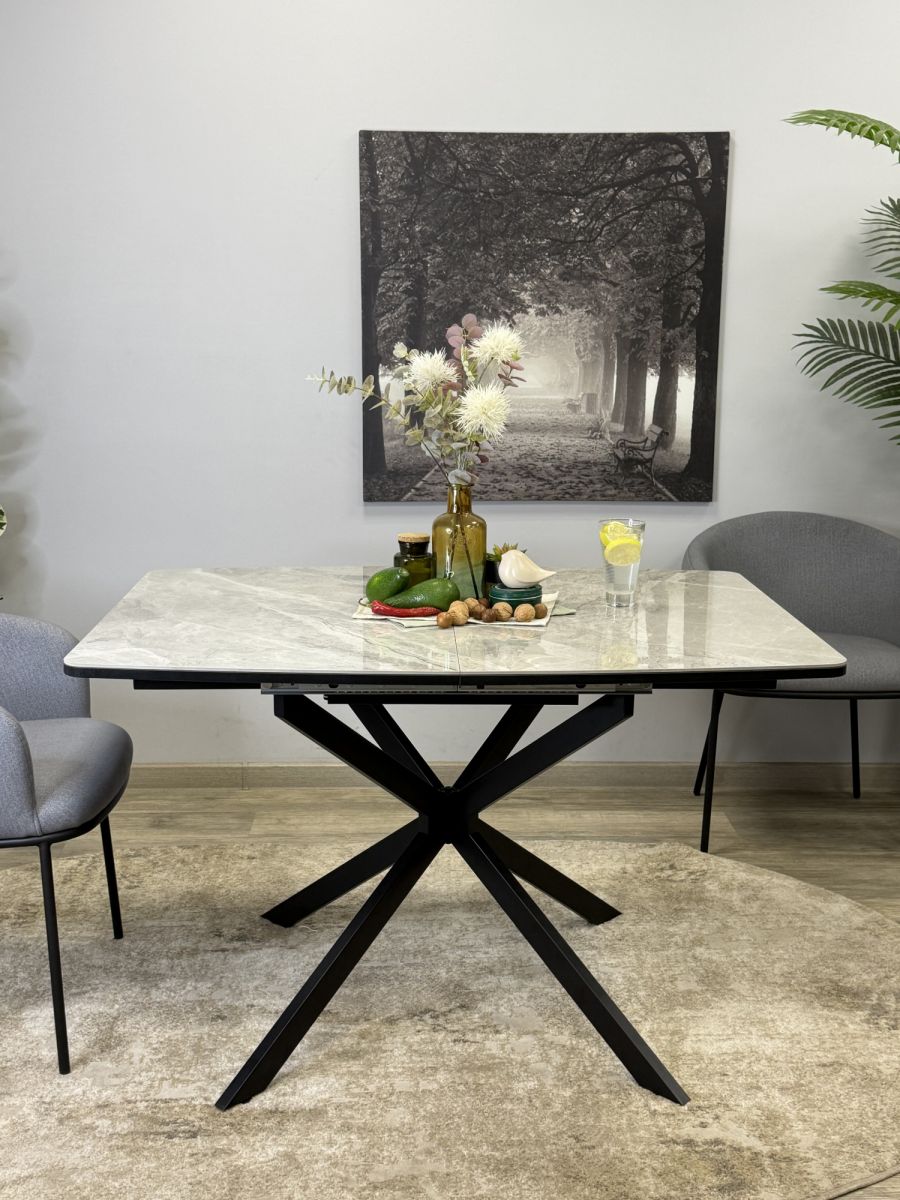 Современный стол на центральных металлических опорах, большого сечения, керамической столешницей с декором "мрамор белый". Стол в сложенном состоянии спокойно размещает 8 человек и 12 человек в разложенном. Большим преимуществом стола является торцевой механизм раскладки. . Механизм не перекашивается при открывании одной рукой, на каждое крыло может спокойно опереться человек.ОСНОВНЫЕ ПРЕИМУЩЕСТВА Большой, роскошный, удобный и очень практичный стол с оптимальной формой столешницы и очень надежным основанием Столешница премиум-класса Столешница с покрытием из натуральной керамики сплошная, без щелей, что облегчает уход и ежедневную эксплуатацию. Керамика - наилучший и самый дорогой материал для обеденного стола. Она не портится от влаги, выдерживает температуру до 1000°С. Плотность керамики выше плотности металла и на ней не останутся следы от столовых приборов. Кроме того, это 100% натуральный материал в отличие от разного вида пластиков Высокая надежность материалов У