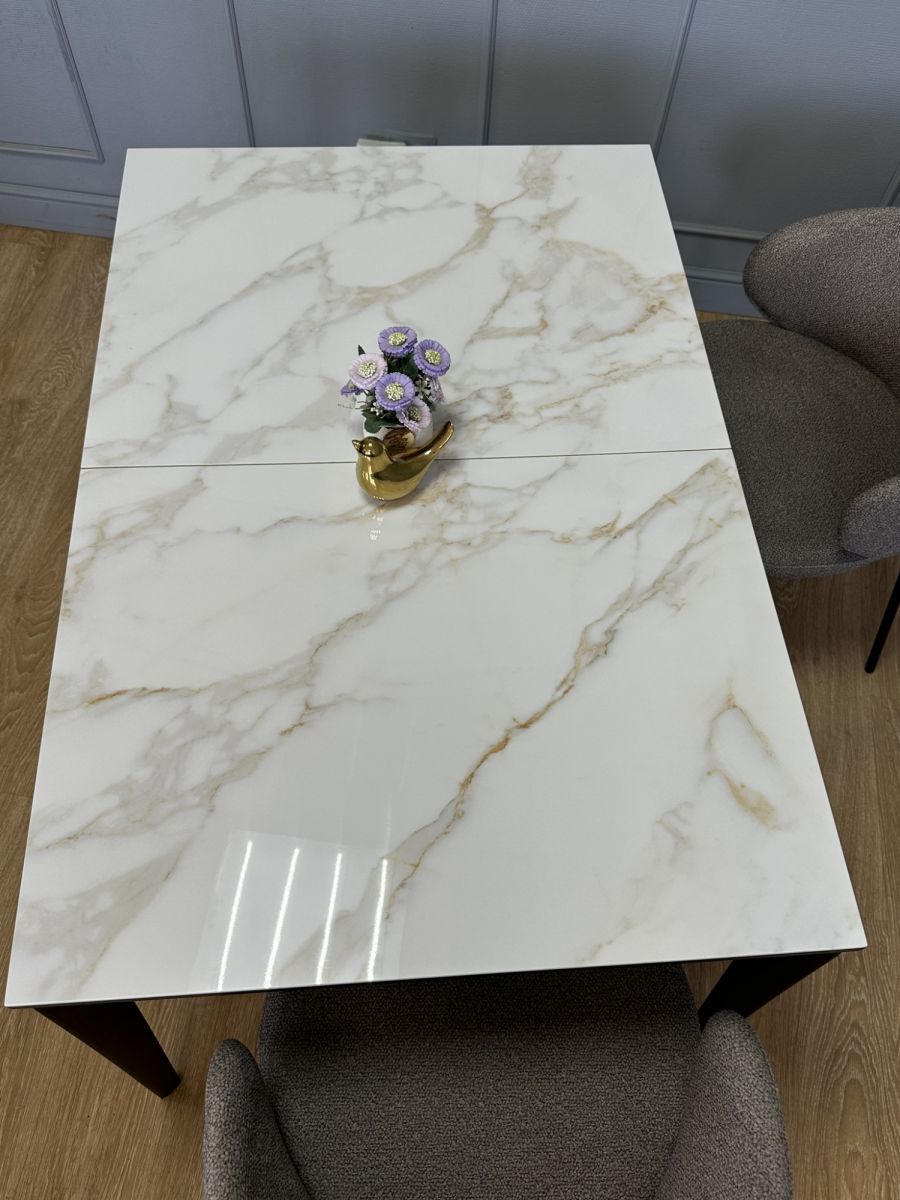 Стол с керамической столешницей и красивыми, функциональными опорами. Керамических столов такого размера очень мало, а размер 120*80см оптимален для кухни до 13м. Система раскладки увеличивает стол еще на 45см благодаря синхронному механизму раздвижения и прогрессивного механизму вставки "дельфин". Вставка с керамикой очень тяжелая и требует специального механизма, предназначенного для керамики. Стол сможет разложить даже ребенок. ОСНОВНЫЕ ПРЕИМУЩЕСТВА KR1200 столы с керамической столешницей как правило выпускаются шириной 140-160см и более. Стол идеален для того, чтобы не занимать половину кухни. А при желании он разложится до 165см благодаря абсолютно новому механизму "дельфин" Столешница премиум-класса Керамика - наилучший и самый дорогой материал для обеденного стола. Она не портится от влаги, выдерживает температуру до 1000°С. Плотность керамики выше плотности металла и на ней не останутся следы от столовых приборов. Кроме того это 100% натуральный материал в о