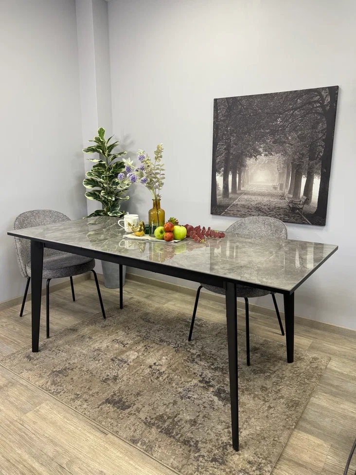 KR1400 – стильный и практичный стол с керамической столешницей, которая отличается высокой прочностью и долговечностью. Благодаря своему материалу, она не подвержена воздействию влаги, высоких температур и механических повреждений, что делает ее отличным выбором для использования на кухне. Каркас выполнен из стального профиля и окрашен в черный цвет, который гармонично сочетается с белоснежной глянцевой поверхностью керамики.ОСНОВНЫЕ ПРЕИМУЩЕСТВА  Модель оснащена тонкой рамой,  Тонкая элегантная рама создает простор для ног, позволяя сидеть "нога на ногу" без дискомфорта. Удобные отдельностоящие опоры не мешают гостям, а скругленные травмобезопасные края столешницы позаботятся о вашей безопасности. Столешница премиум-класса Керамика - наилучший и самый дорогой материал для обеденного стола. Она не портится от влаги, выдерживает температуру до 1000°С. Плотность керамики выше плотности металла и на ней не останутся следы от столовых приборов. Кроме того, это 100% натуральный м