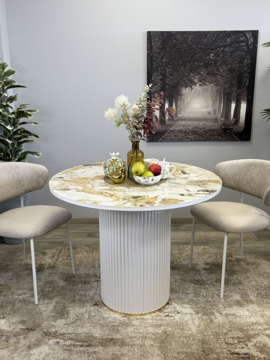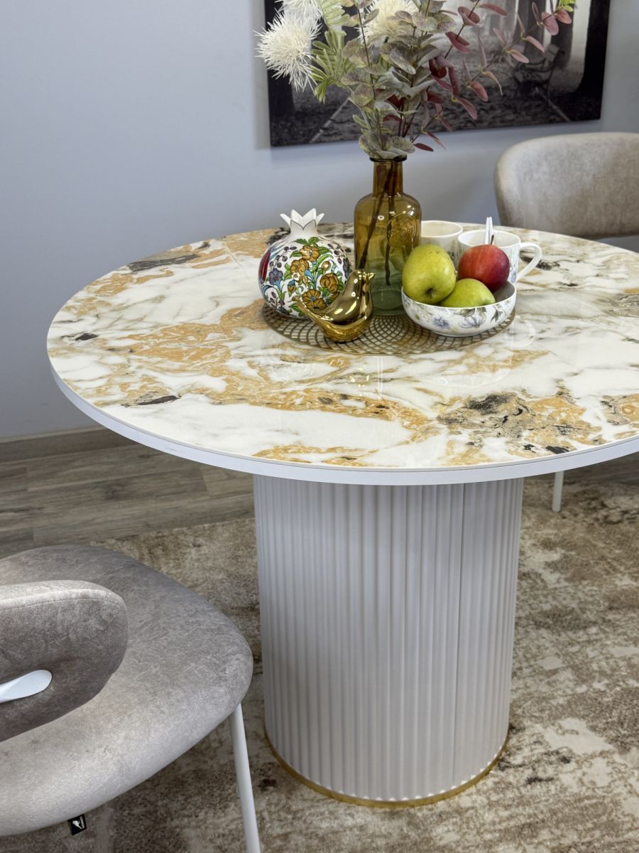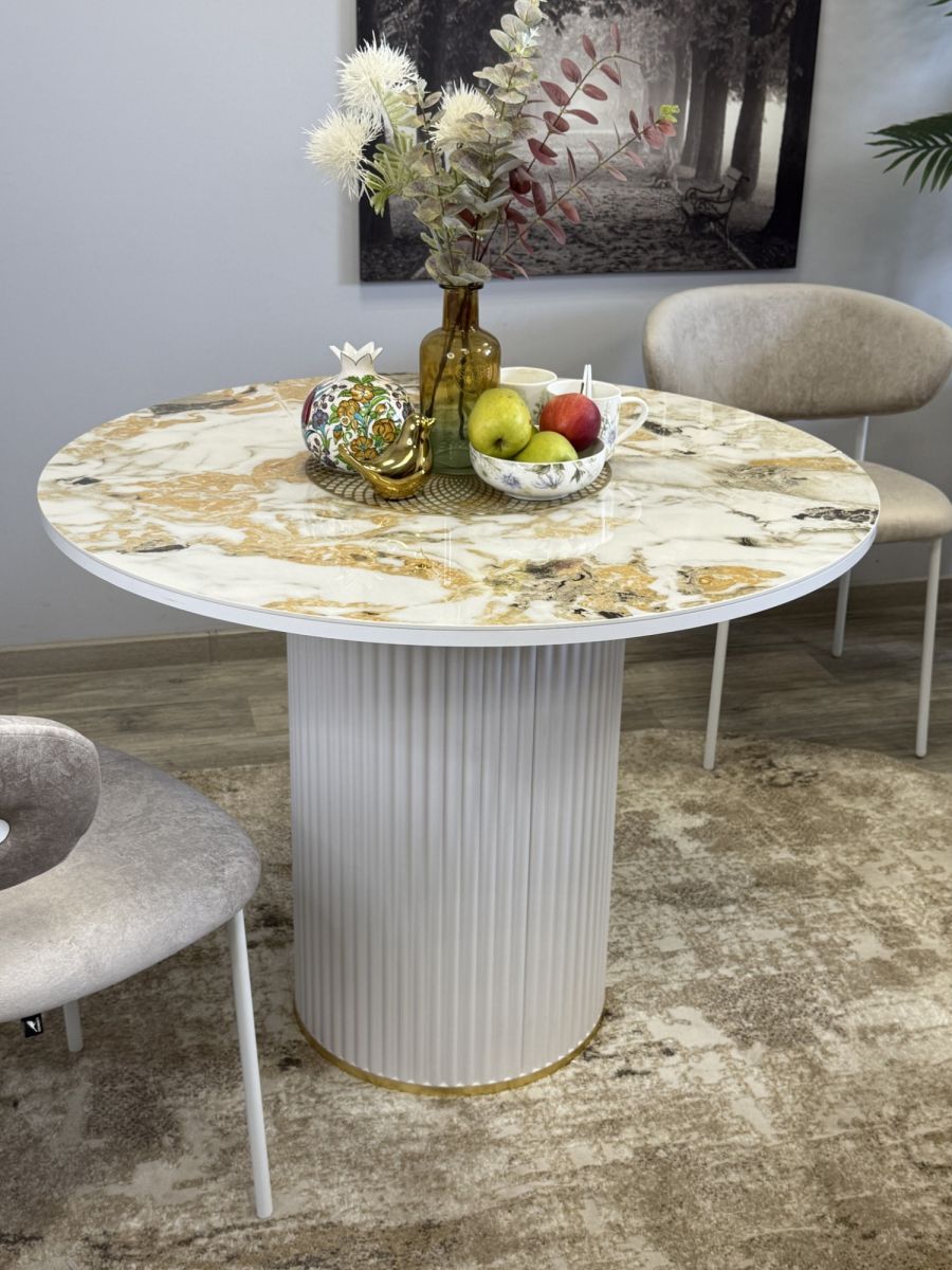 Привлекательный столик без устройства трансформации, невероятно устойчив, гармонирует с актуальным оформлением современных кухонных интерьеров. Предусмотрено пространство для комфорта ног. Эксклюзивная блестящая керамическая поверхность придаёт изысканности внешнему виду   ОСНОВНЫЕ ПРЕИМУЩЕСТВА   Глянцевая керамическая плитка очень привлекательна благодаря своему современному дизайну. Она удобна в использовании, так как колени не касаются поверхности стола. Это идеальный выбор для размещения четырех персон.   Столешница премиум класса   Керамика устойчива к металлическим предметам, выдерживает жар до тысячи градусов и выглядит безукоризненно. Также материал безопасен для аллергиков, позволяя размещать еду прямо на поверхности.Высокая надежность материаловГлавная стойка из велюрового материала идеально сочетается с кухонными фасадами, уменьшает скопление пыли и облегчает процесс уборки. Характеризуется повышенной прочностью. Цвет белый/керамика гранит золотой глянец Гарантия 24 месяца