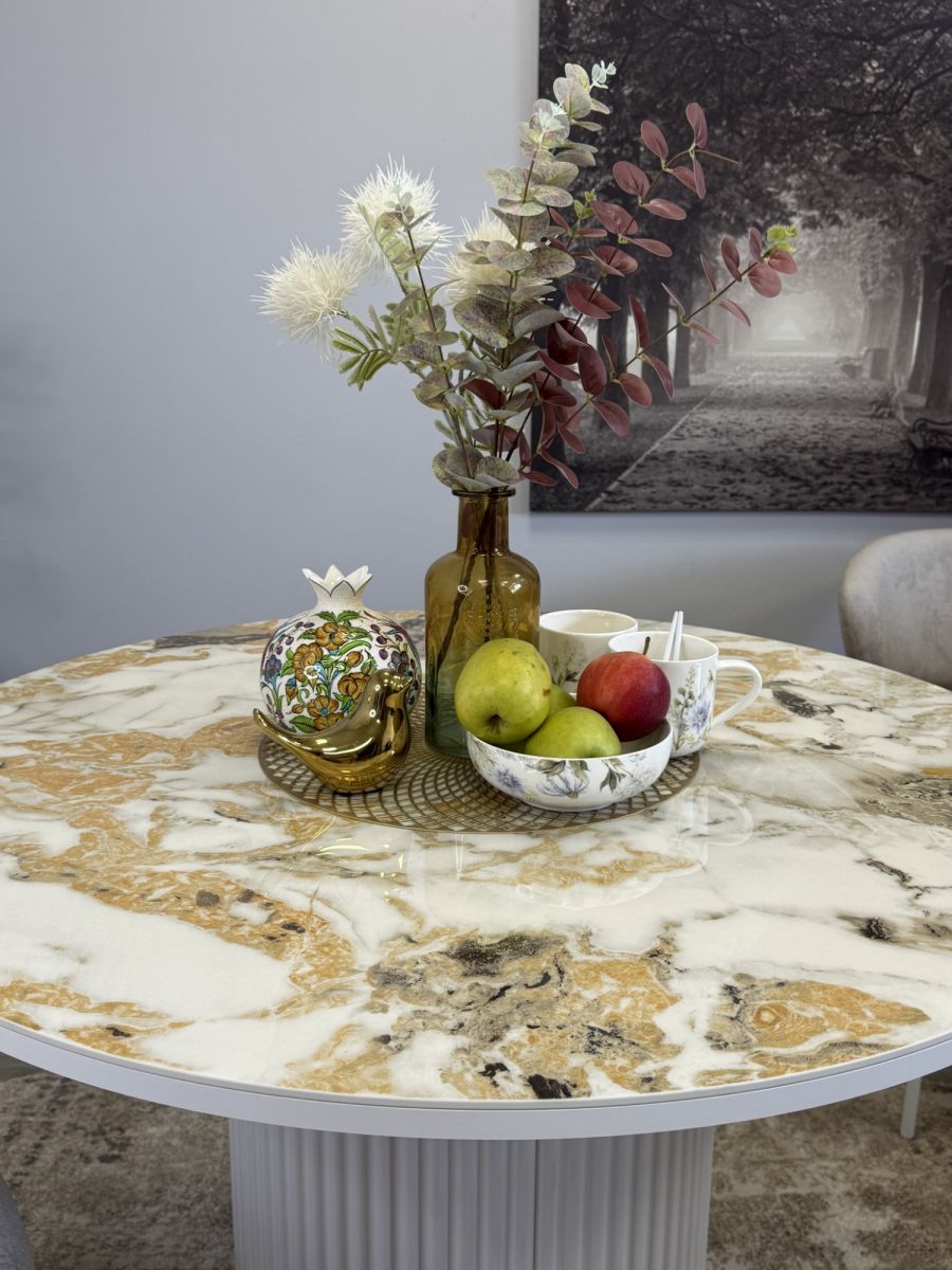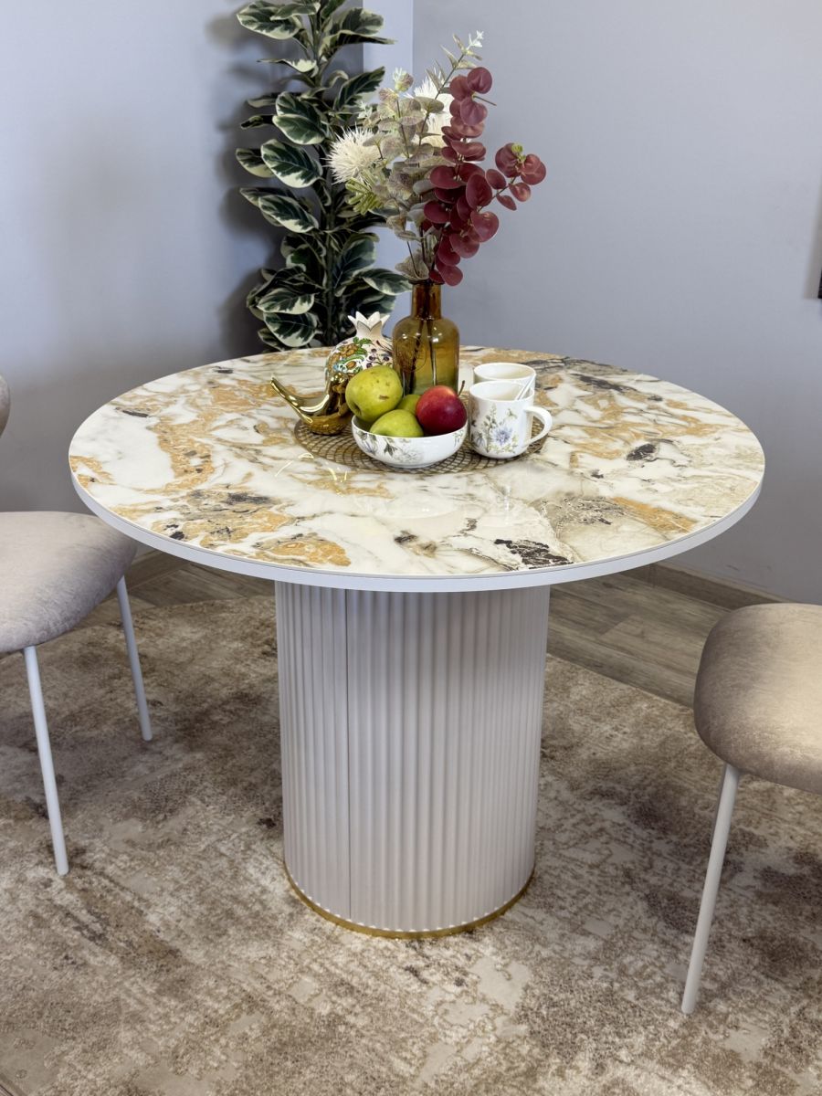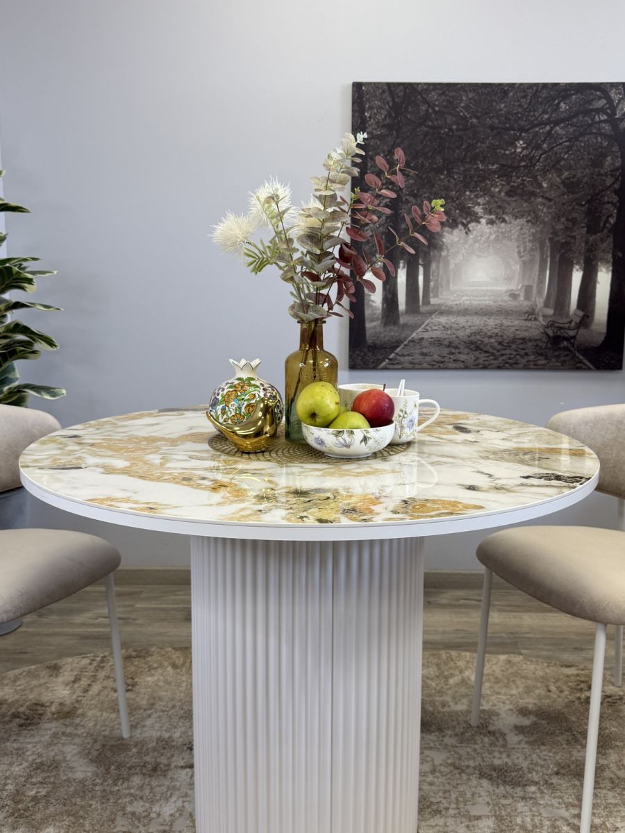 Привлекательный столик без устройства трансформации, невероятно устойчив, гармонирует с актуальным оформлением современных кухонных интерьеров. Предусмотрено пространство для комфорта ног. Эксклюзивная блестящая керамическая поверхность придаёт изысканности внешнему виду   ОСНОВНЫЕ ПРЕИМУЩЕСТВА   Глянцевая керамическая плитка очень привлекательна благодаря своему современному дизайну. Она удобна в использовании, так как колени не касаются поверхности стола. Это идеальный выбор для размещения четырех персон.   Столешница премиум класса   Керамика устойчива к металлическим предметам, выдерживает жар до тысячи градусов и выглядит безукоризненно. Также материал безопасен для аллергиков, позволяя размещать еду прямо на поверхности.Высокая надежность материаловГлавная стойка из велюрового материала идеально сочетается с кухонными фасадами, уменьшает скопление пыли и облегчает процесс уборки. Характеризуется повышенной прочностью. Цвет белый/керамика гранит золотой глянец Гарантия 24 месяца